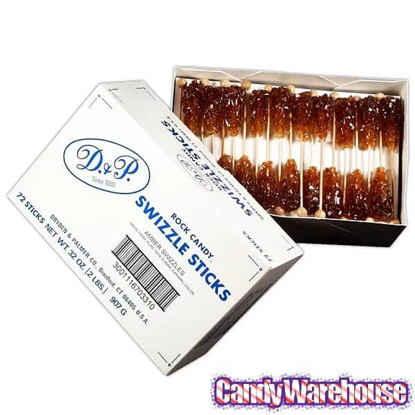 Yummy amber rock candy!Stick Length: 5 1/2 InchesThere are approximately 2 inches of rock candy on each stick.Box contains 72 Amber Rock Candy Swizzle Sticks.Made in the USA. Kosher Certified.