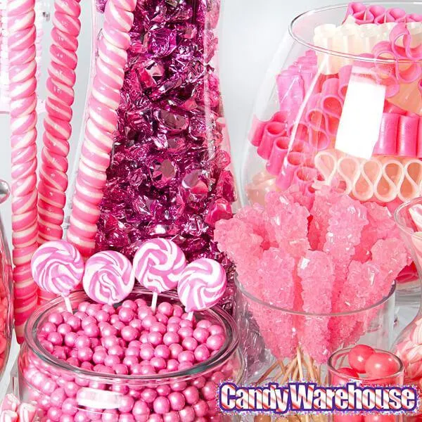 Case contains 100 wrapped Pink Rock Candy Crystal Sticks, each with a net weight of .6 ounce.
