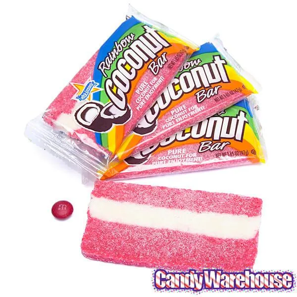 Display box contains 24 Rainbow Coconut Candy Bars, each with a net weight of 1.65 ounces.