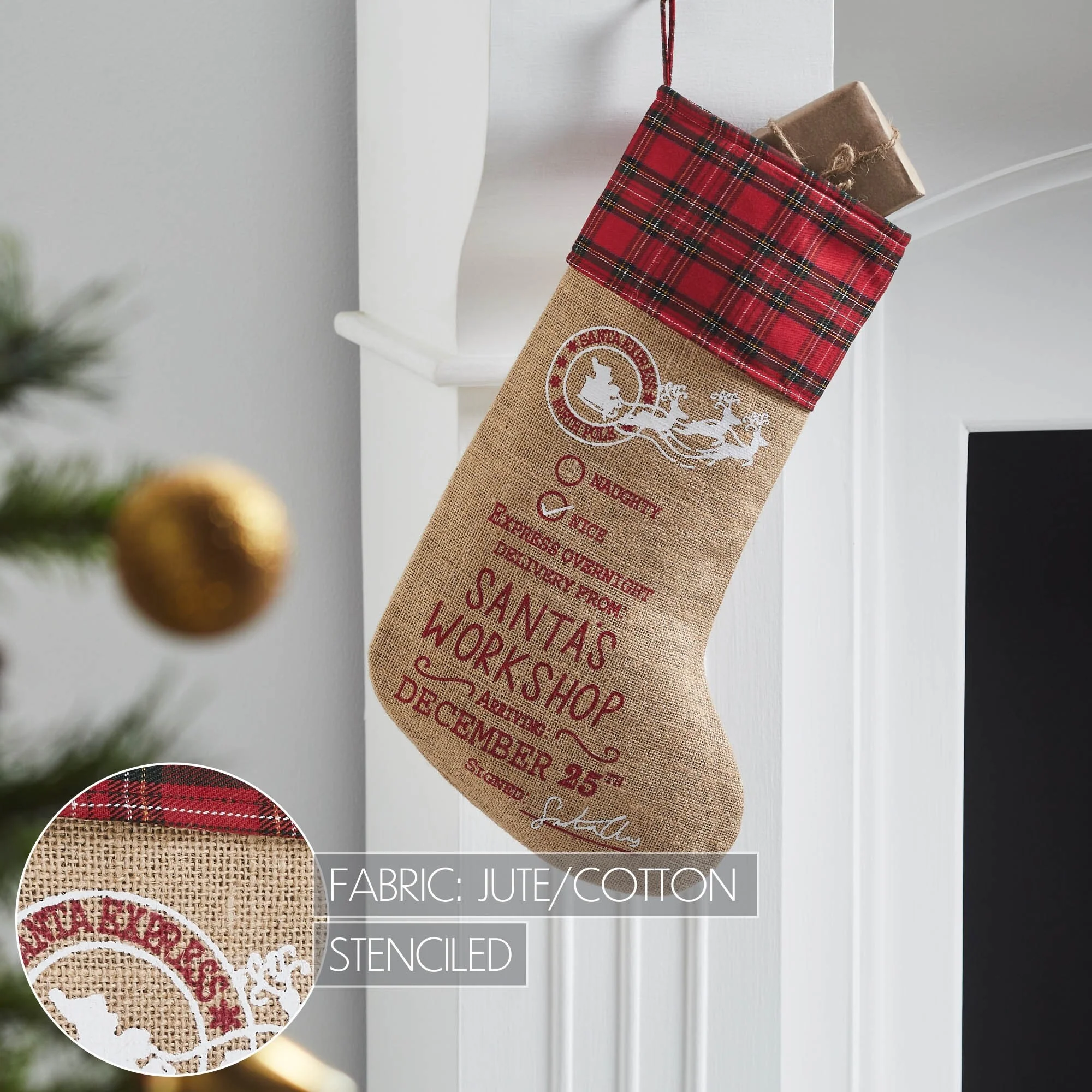 Introducing the VHC Brands Burlap Natural Jute Plaid Santa's Workshop Stocking, a charming addition to your farmhouse Christmas decor that evokes the warmth and nostalgia of the holiday season. Crafted from jute, this stocking measures 12x20 inches and features a delightful design that captures the essence of Santa's workshop. Adorned with the message Express Overnight Delivery From Santa's Workshop and featuring a charming image of Santa's sleigh, this stocking adds a touch of festive cheer to any space. The natural tan, bright red, and country black color palette of this stocking complements a variety of decor styles, making it a versatile choice for your holiday decorating needs. Whether hung by the fireplace, staircase, or mantle, it brings a cozy and inviting atmosphere to your entryway or living room. With its printed text and distressed appearance, this stocking exudes rustic charm and adds a nostalgic feel to your Christmas decorations. Complete your farmhouse Christmas decor with the VHC Brands Burlap Natural Jute Plaid Santa's Workshop Stocking, a timeless accent that celebrates the magic of the holiday season. Made from durable jute material and featuring a classic design, this stocking is sure to become a cherished part of your holiday traditions for years to come. Hang it with care and fill it with goodies from Santa for a festive and memorable Christmas morning.