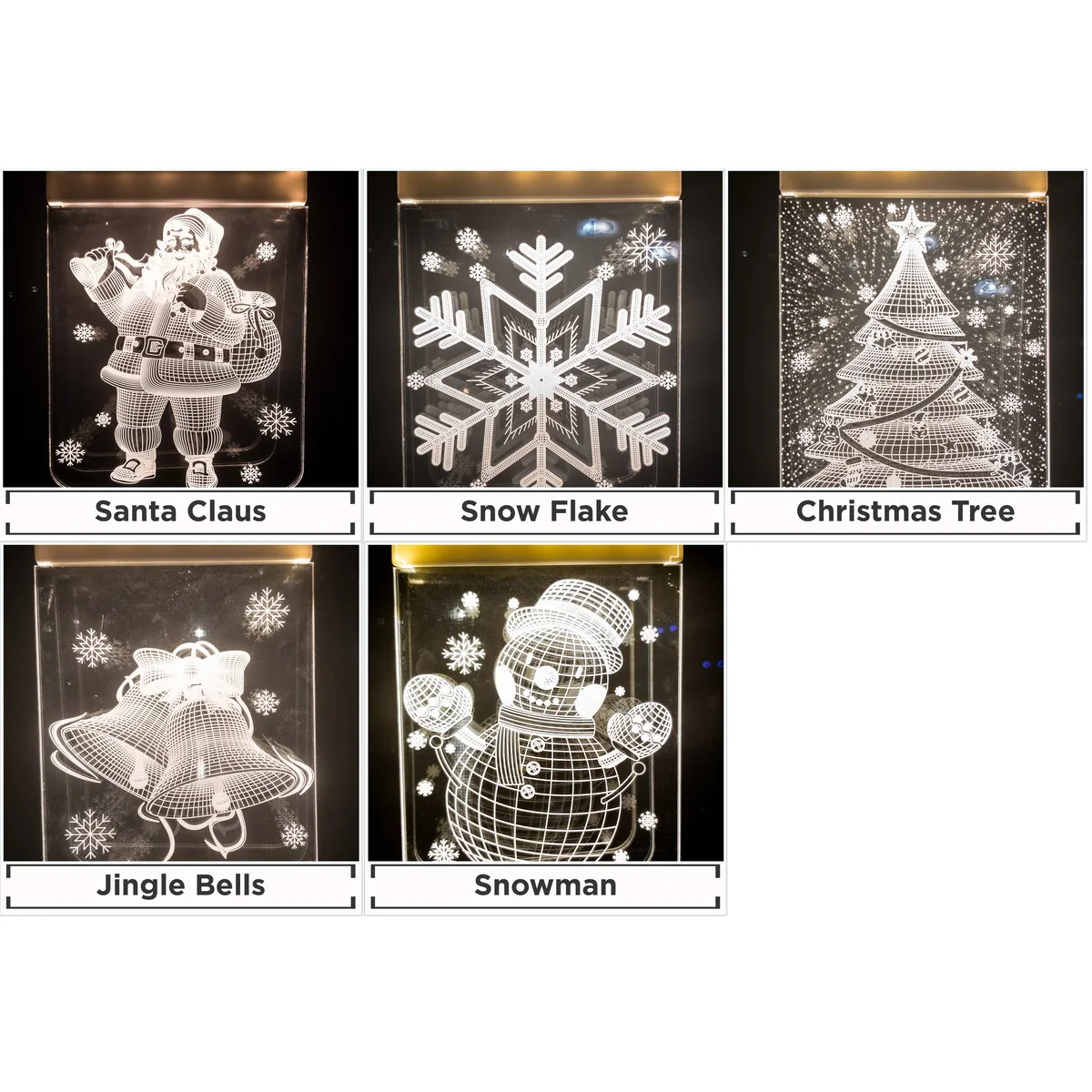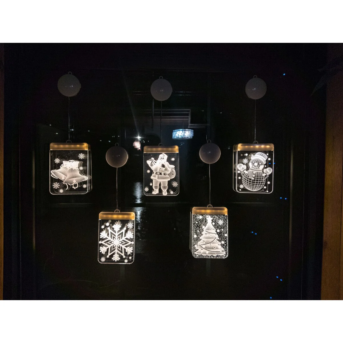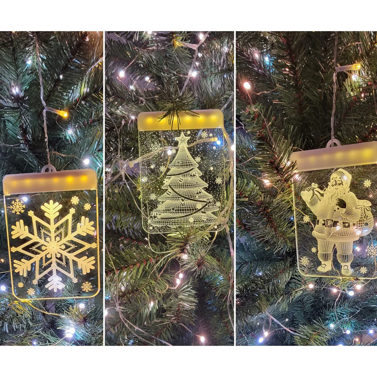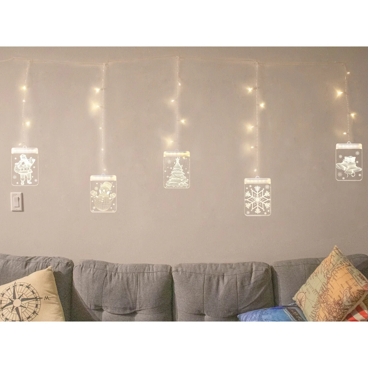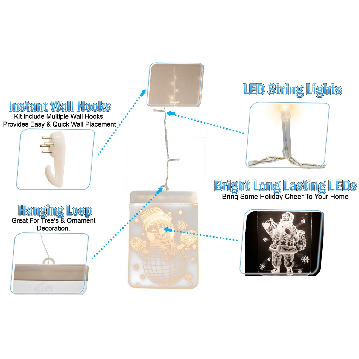 These attractive 3D LEDs Christmas curtain lights with its gorgeous 3D light effect are perfect for your home and adds some holiday cheer to your decor. These translucent plates create a 3D see through effect that can be hung or attached multiple different ways. The hanging loop is perfect for Christmas Tree ornament hanging. The included wall hooks allows almost instant placement on walls in different configurations. Great for placing about windows and letting then twinkle at night. Perfect for stocking stuffers, Christmas Tree hanging ornaments, windows, and patio. The LED's will last a lifetime and are energy efficient. They are USB powered so they are safe and allows you to power them through multiple different methods. Such as wall sockets, power banks, computers and the like. 5 different 3D holiday design are included with each purchase which are Santa Claus, snowman, snowflake, Christmas tree shape, & jingle bells. Make your Christmas look more colorful.