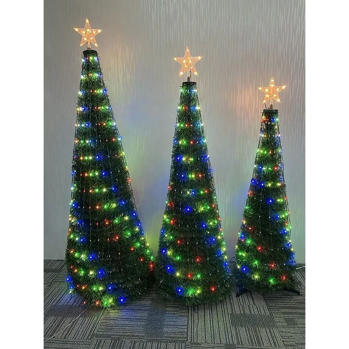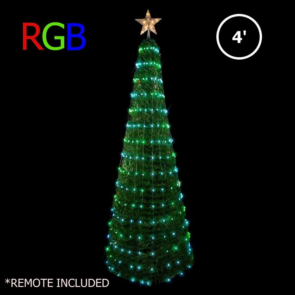 Our 4' RGB Color Changing Dancing Christmas tree will add a magical vibe to your outdoor or indoor Christmas displays. This artificial POP-UP Christmas tree is pre-lit with 186 Color-Changing Big Seed Micro LED Ribbon lights with a LED Star topper. The 32 function remote is preprogrammed with many popular lighting effects or choose your own effects that include a variety of different colors, many fading, chasing and twinkling effects. Add some pizazz to your Holidays while controlling your lights from the warmth of you home. Who needs Disneyland when you can bring the magic home with our Dancing Color Changing Christmas Trees. Mix and match with 4 different sizes available. 4ft, 5ft, 6ft and 8ft. The perfect gift for family and friends or the neighborhood. Set up is quick and easy right out of the box. 4' Color Changing 186 LED RGB Dancing Pop-Up Christmas Tree with 32 Function RemotePre-Lit Artificial Christmas Tree(Pop-Up Design)186 Color Changing Micro Big Seed RGB LEDs7 Warm White LEDs Star Topper32 Function RemoteLights Effects: Fading, Chasing, Twinkling and many Pre-set Holiday effectsHeight: 48" Width: 20"Easy to AssembleFrame and Base IncludedFold down for wasy storageIndoor and Outdoor Rated