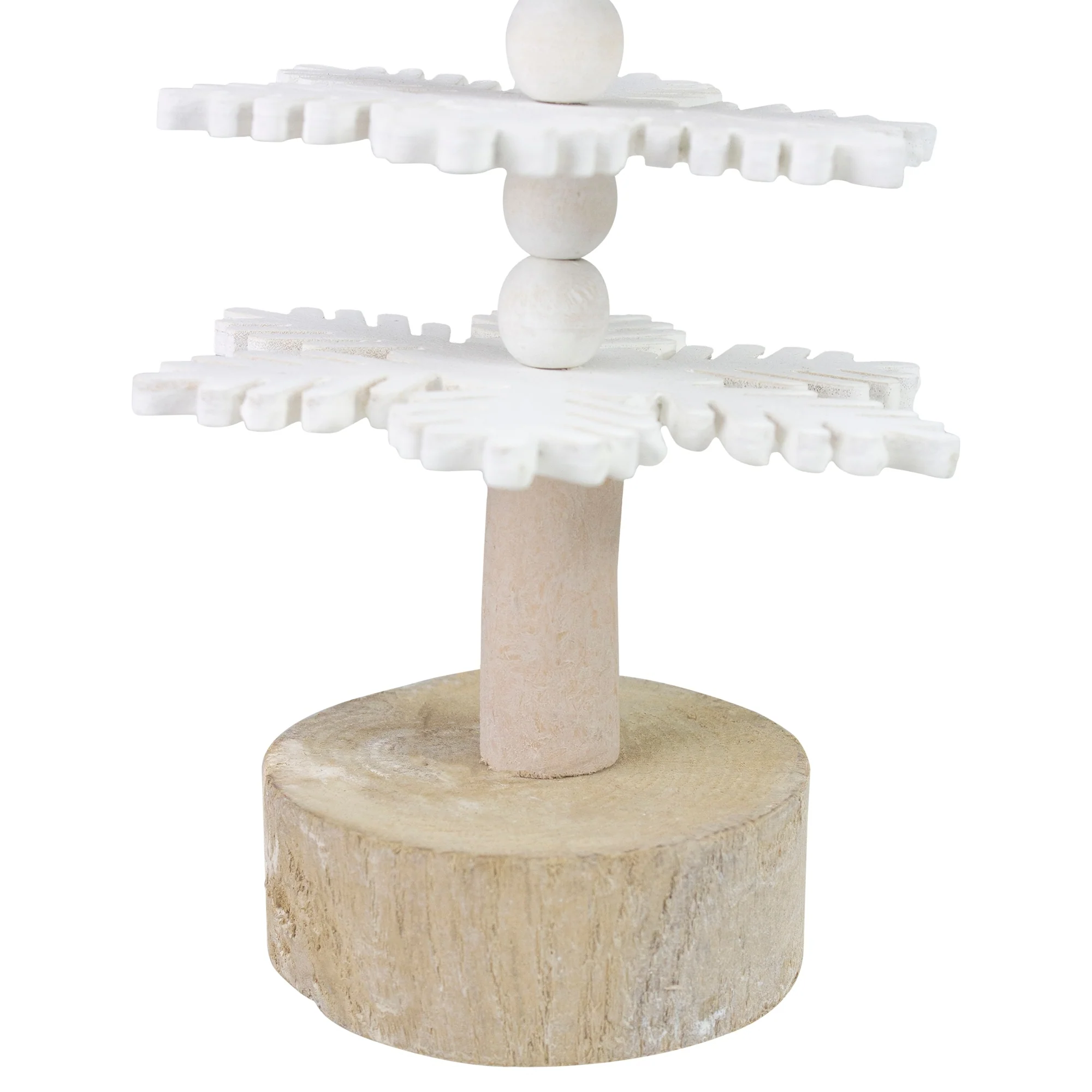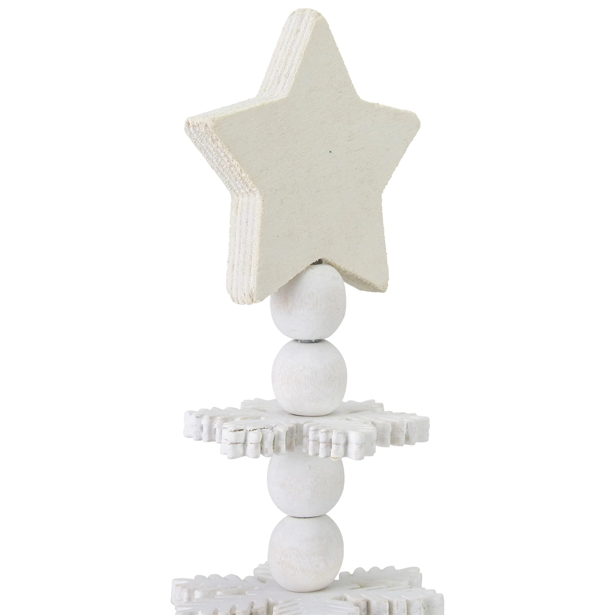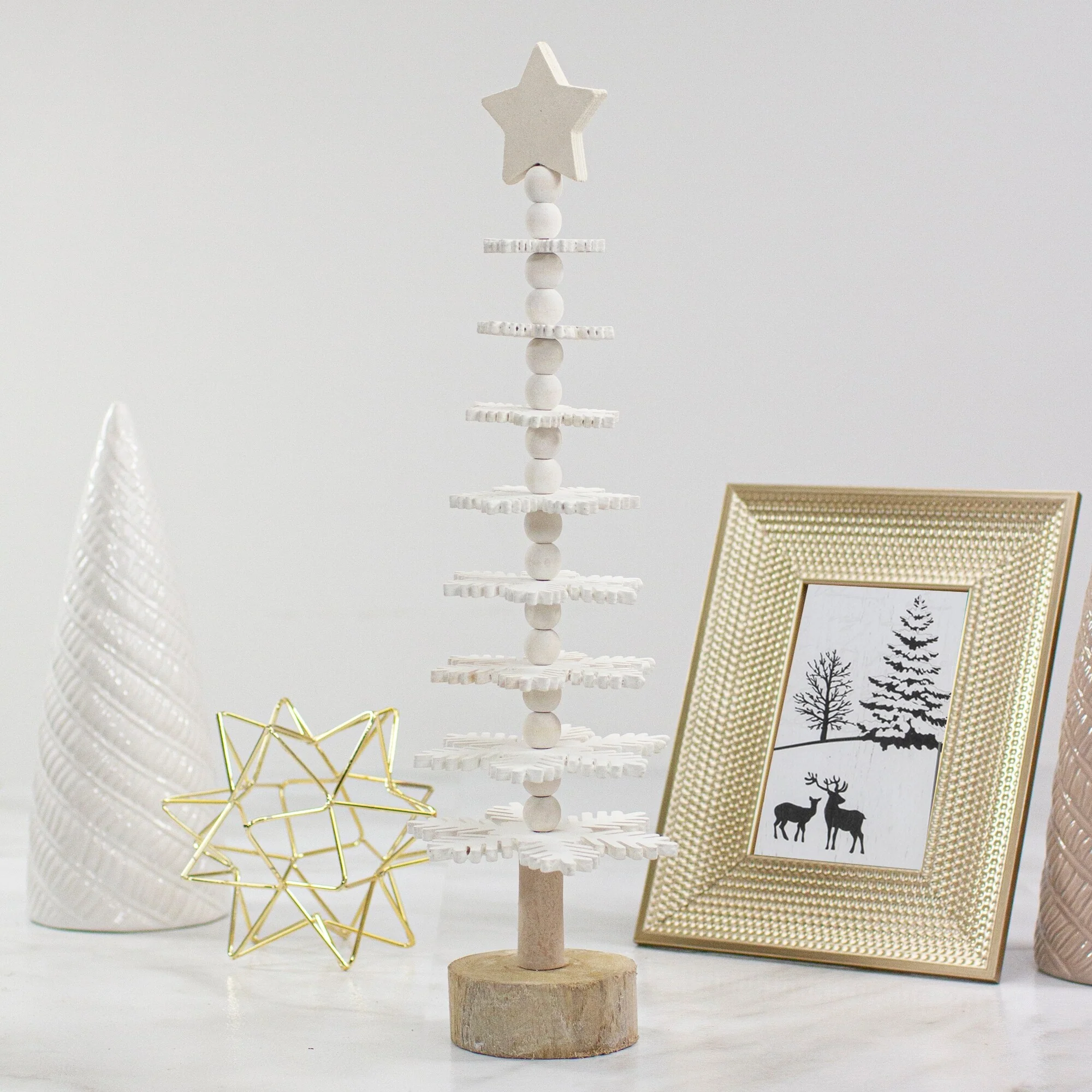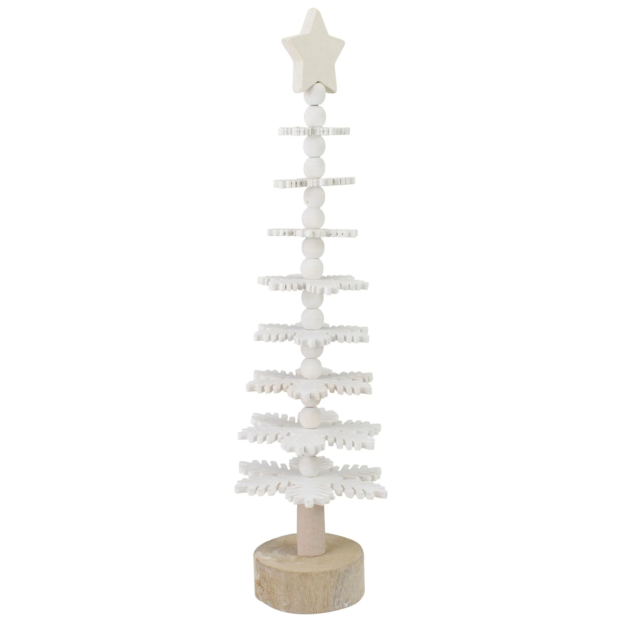 Add this 3-D tree to your Christmas decor! The tree features white snowflake-shaped wooden cutouts that are stacked in the shape of a tree. A 5 point star tree topper captures a handmade design. You can place this on your mantel, fireplace, or even given away as a gift this holiday season!
