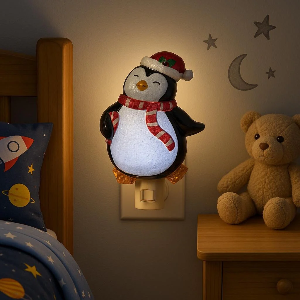 Add holiday cheer to any room with this adorable LED Christmas Penguin Night Light! Perfect for kids' bedrooms, hallways, kitchens, or bathrooms, this festive nightlight features a cute penguin wearing a Santa hat and red scarf, glowing with a warm, comforting light.