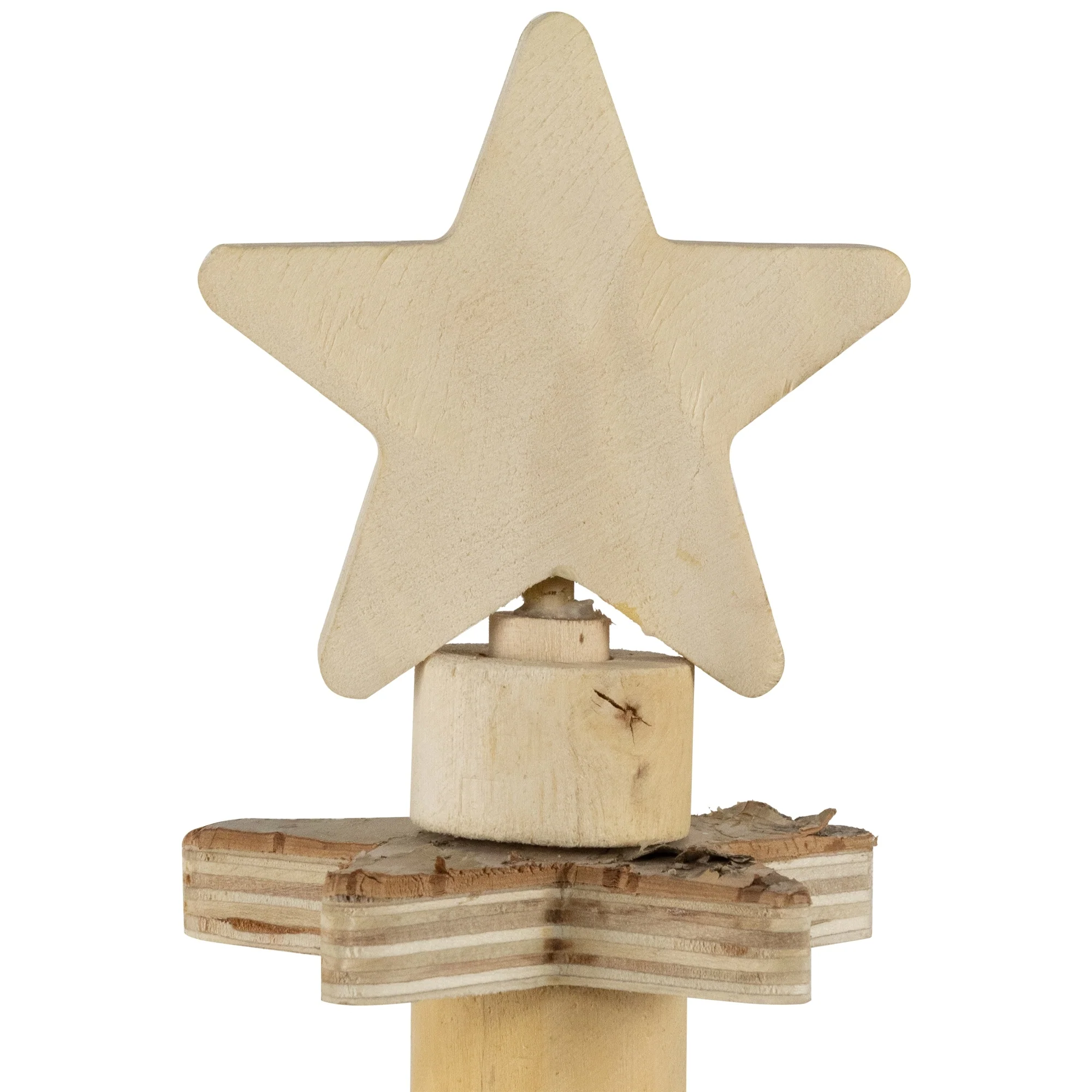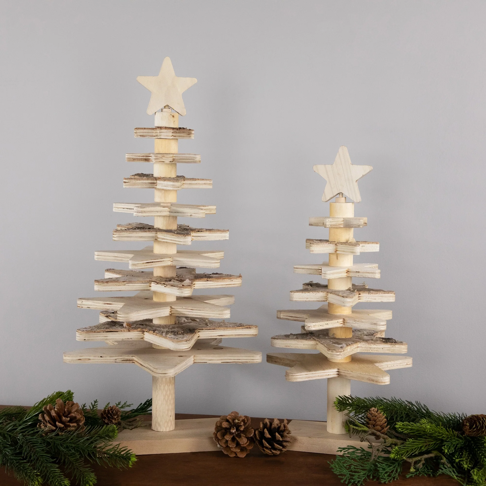 Embrace the spirit of the season with this tabletop Christmas decoration. This unique tree is crafted from star-shaped birch wood cut-outs, skillfully arranged to form a captivating tree silhouette for rustic and dynamic visual appeal. Each tier can be rotated to position the levels as you like. Complete with a star-shaped topper and anchored by a sturdy natural wooden base, this decoration is perfect for holiday table arrangements and festive displays.