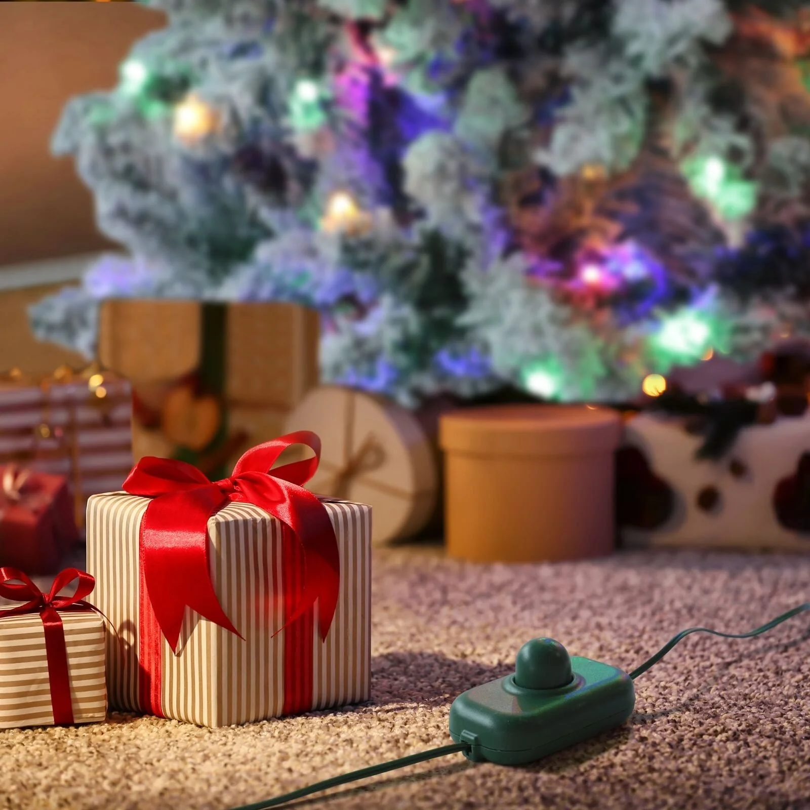 - This flocked Christmas tree with snow comes with lights, emitting a warm natural glow