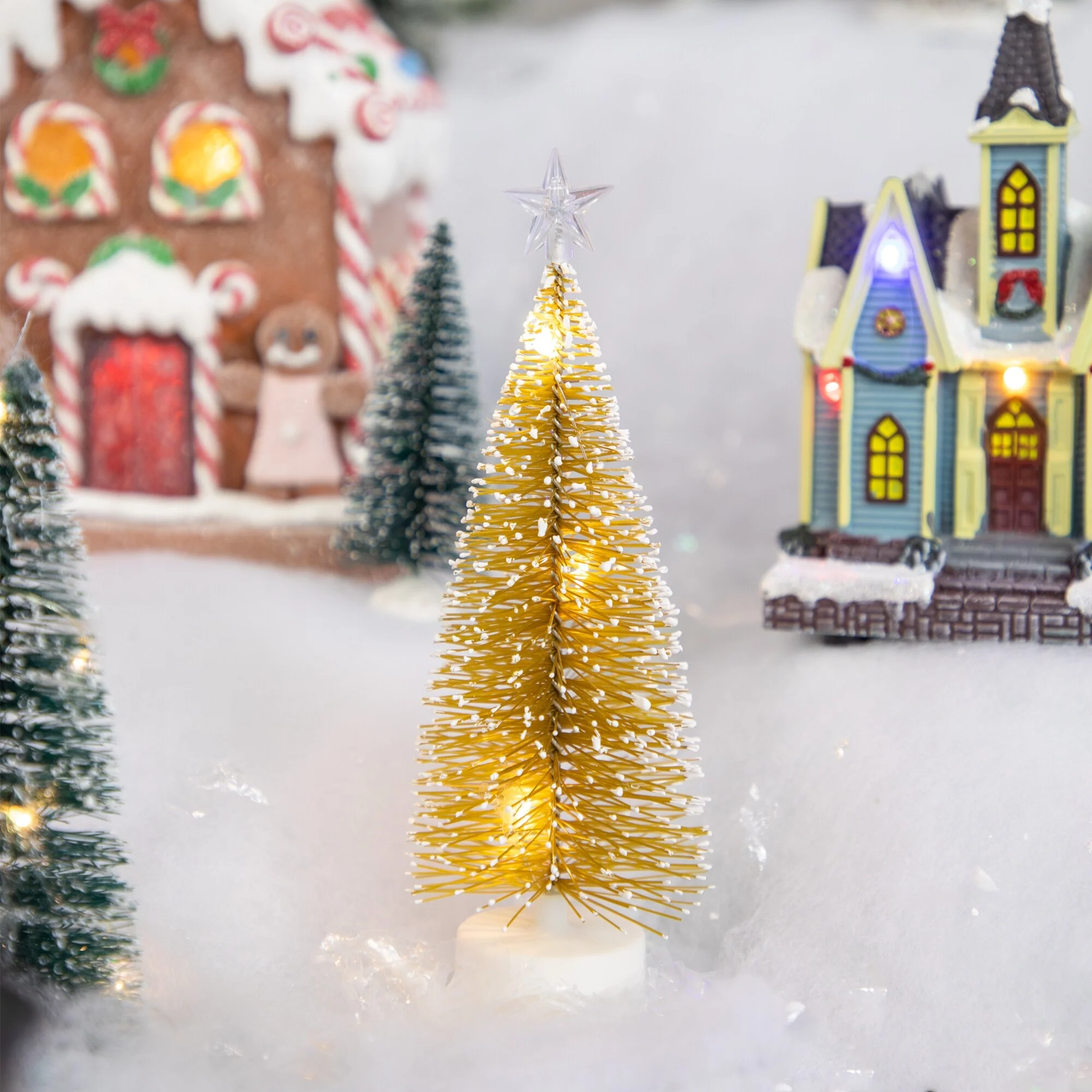 Set of 2 LED Gold Mini Bottle Brush Pine Christmas Village Trees