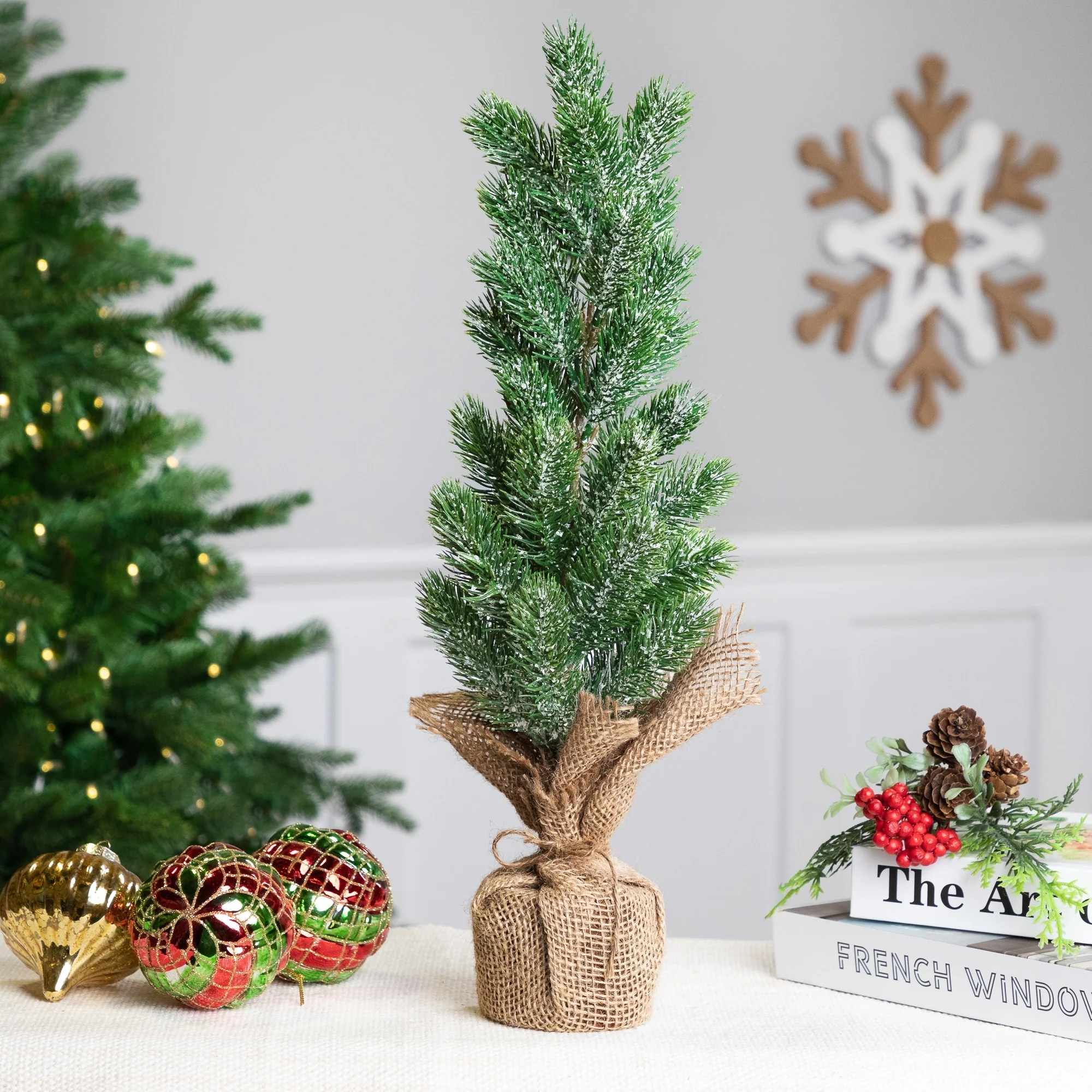 Flocked Mini Pine Slim Artificial Christmas Tree with Jute Base - Unlit - 12" - 1 Foot