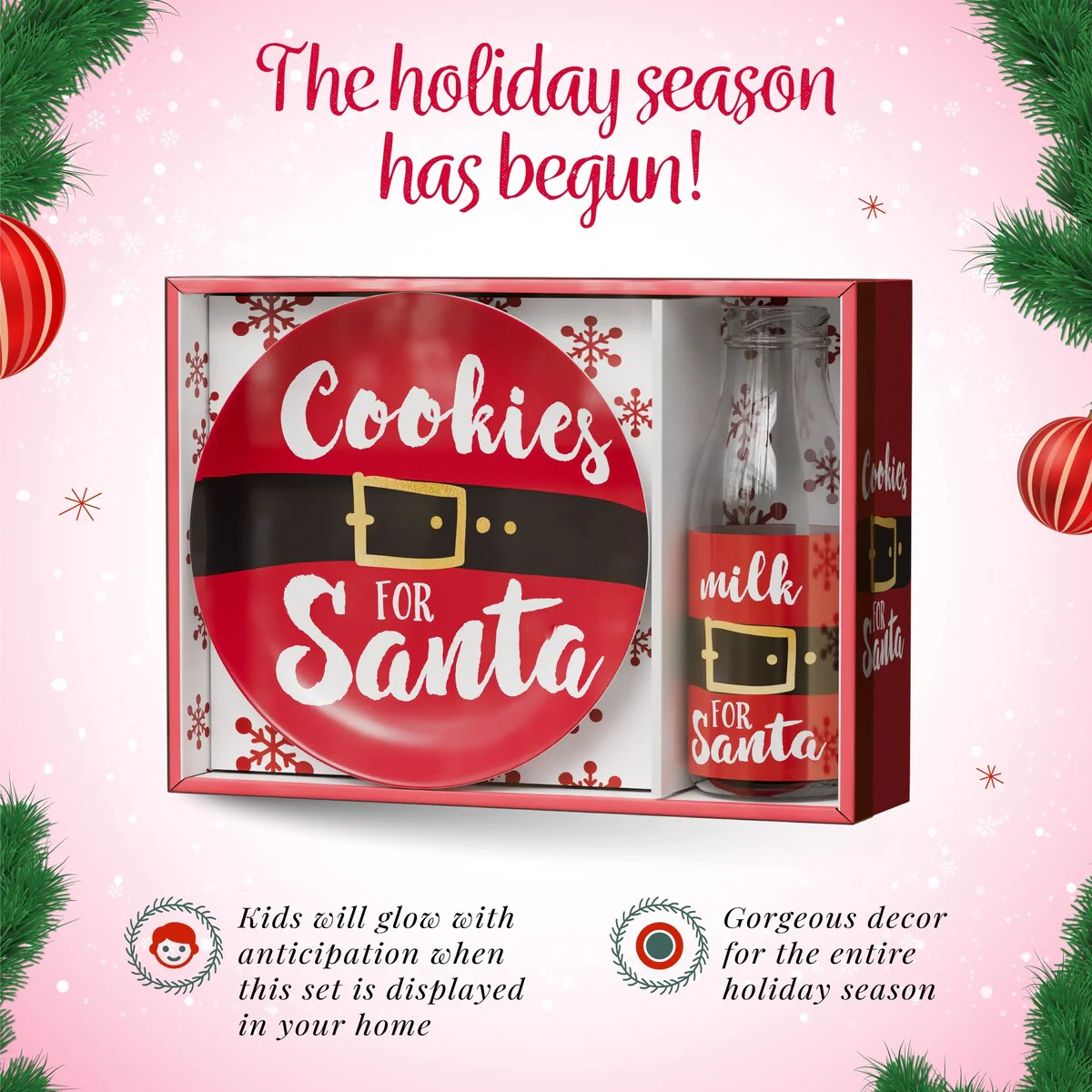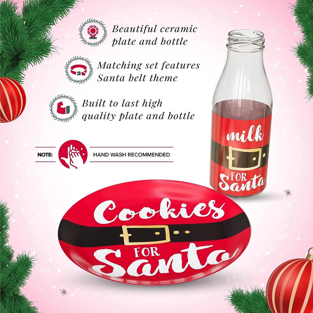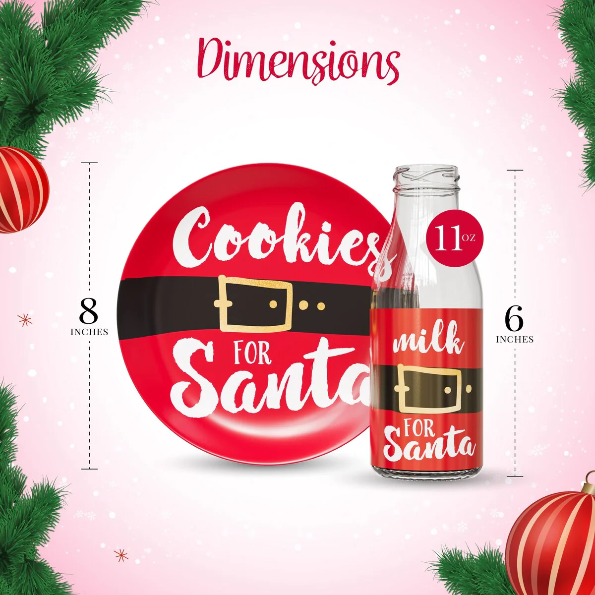 - DESIGN: The set feature Santa's belt. The plate has the phrase "Cookies for Santa" and the bottle says, "Milk for Santa"