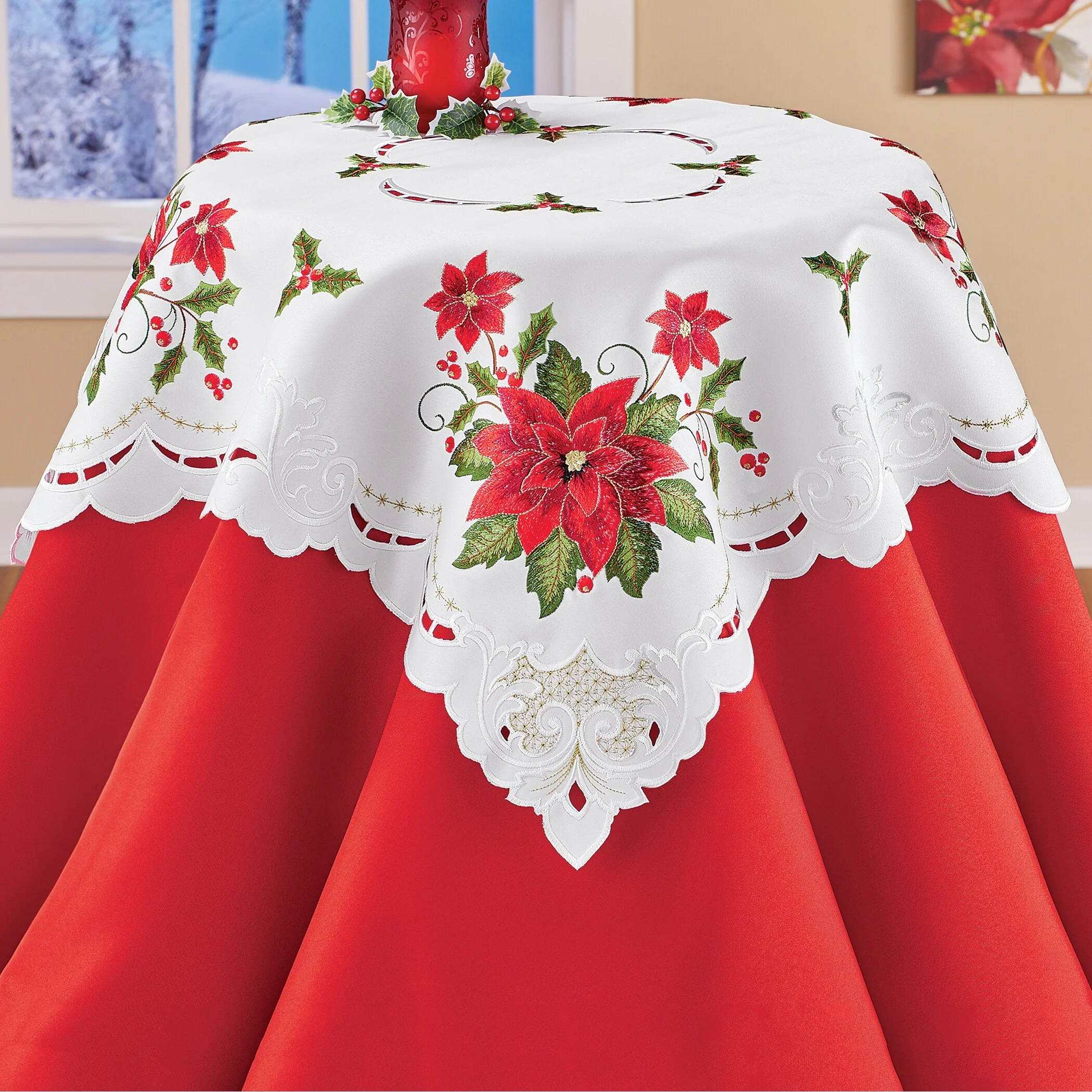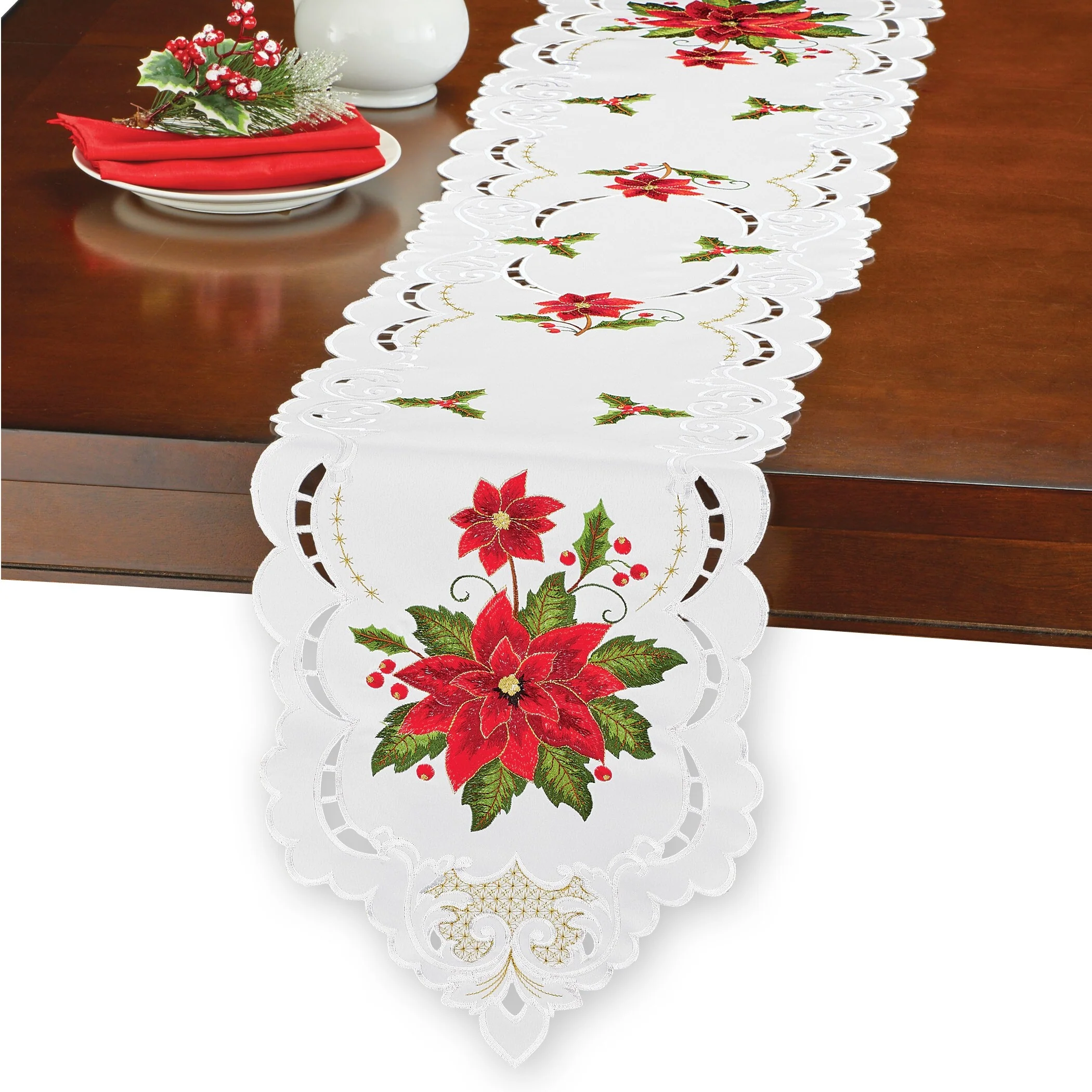 Dress your tables for the holidays with these beautiful poinsettia toppers. Featuring bright red poinsettias, holly leaves and berries embroidered atop a snow white background, they look great on their own or on top of a coordinating tablecloth (sold separately). Machine wash. Polyester; imported. Choose: Runner (68 1/2" x 13") or Square (34"Sq.).