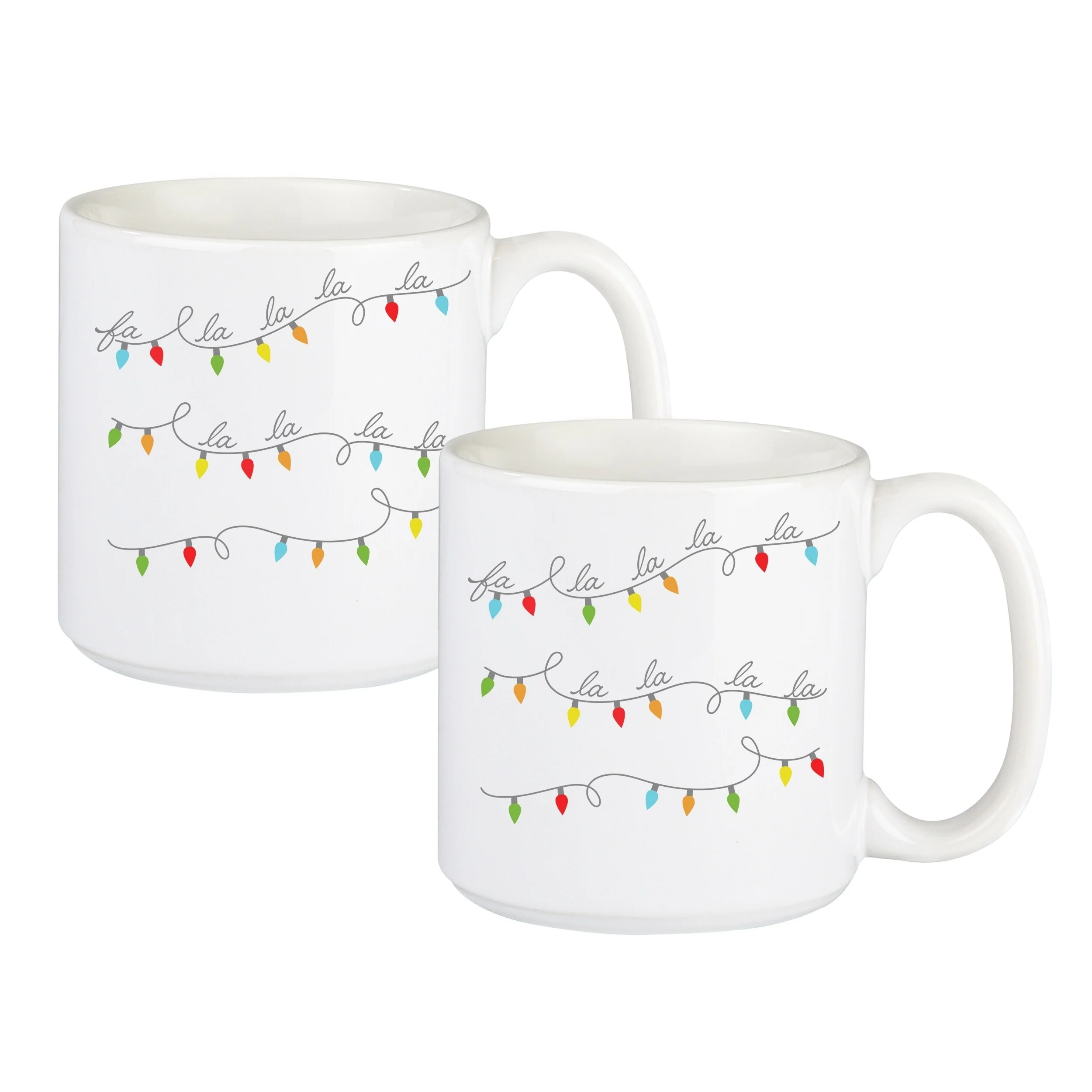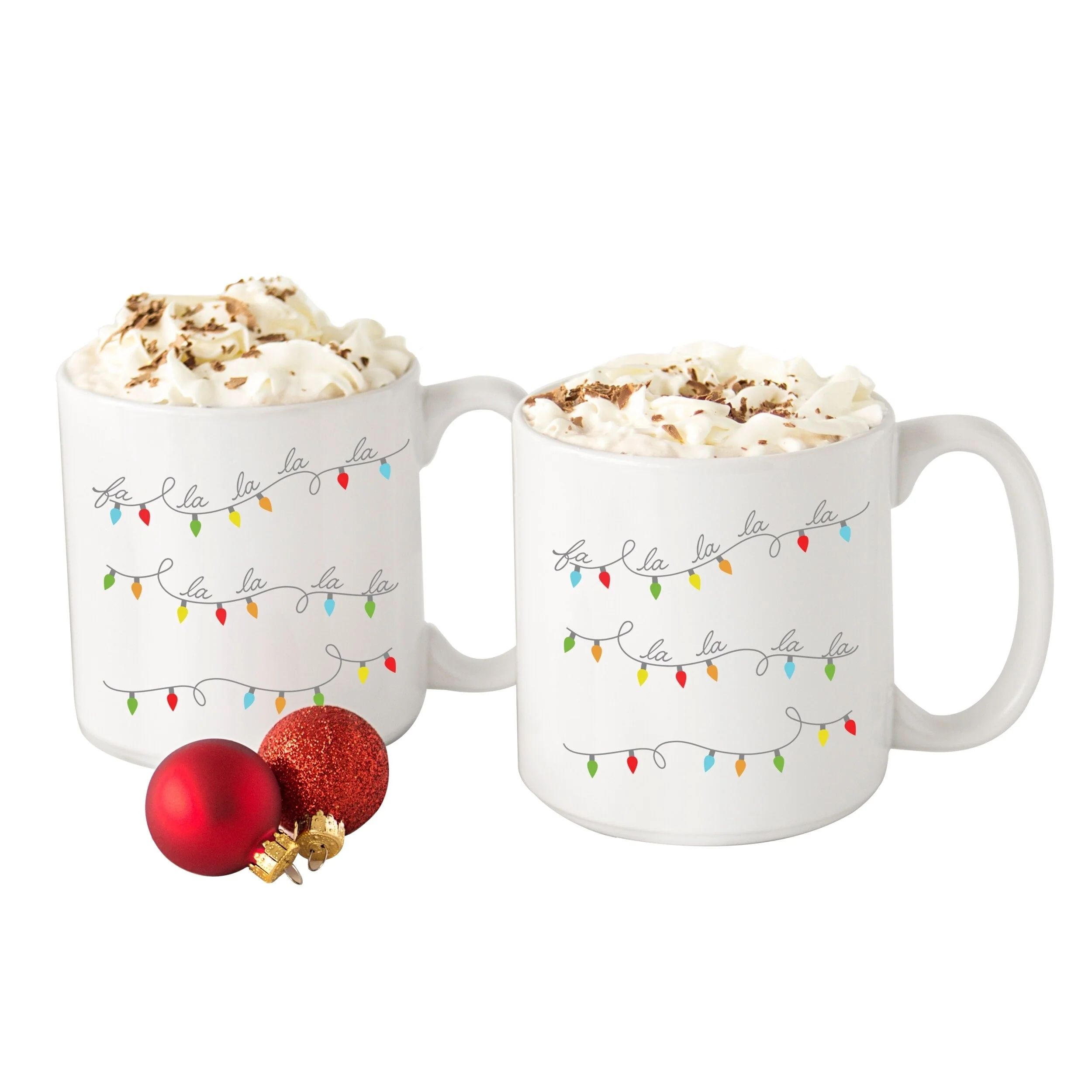 Whether they're filled with hot chocolate or peppermint mochas, the Fa La La Large Coffee Mugs will have you feeling festive this holiday season. These coffee mugs feature wide handles and hold up to 20 oz. of your favorite beverage. A great addition to your home's holiday décor, these mugs will give every day a festive start.Available as shown only.Quantity: Sold in a set of two (2).Dimensions: 3.875" W. x 4.125" H.; holds up to 20 oz. Features: Two (2) 20 oz. ceramic mugs, a large 6-inch handle for a wide grip, and a fun holiday design.Materials: Ceramic.Care Instructions: Dishwasher and microwave safe. Personalization Options: Available as shown only.