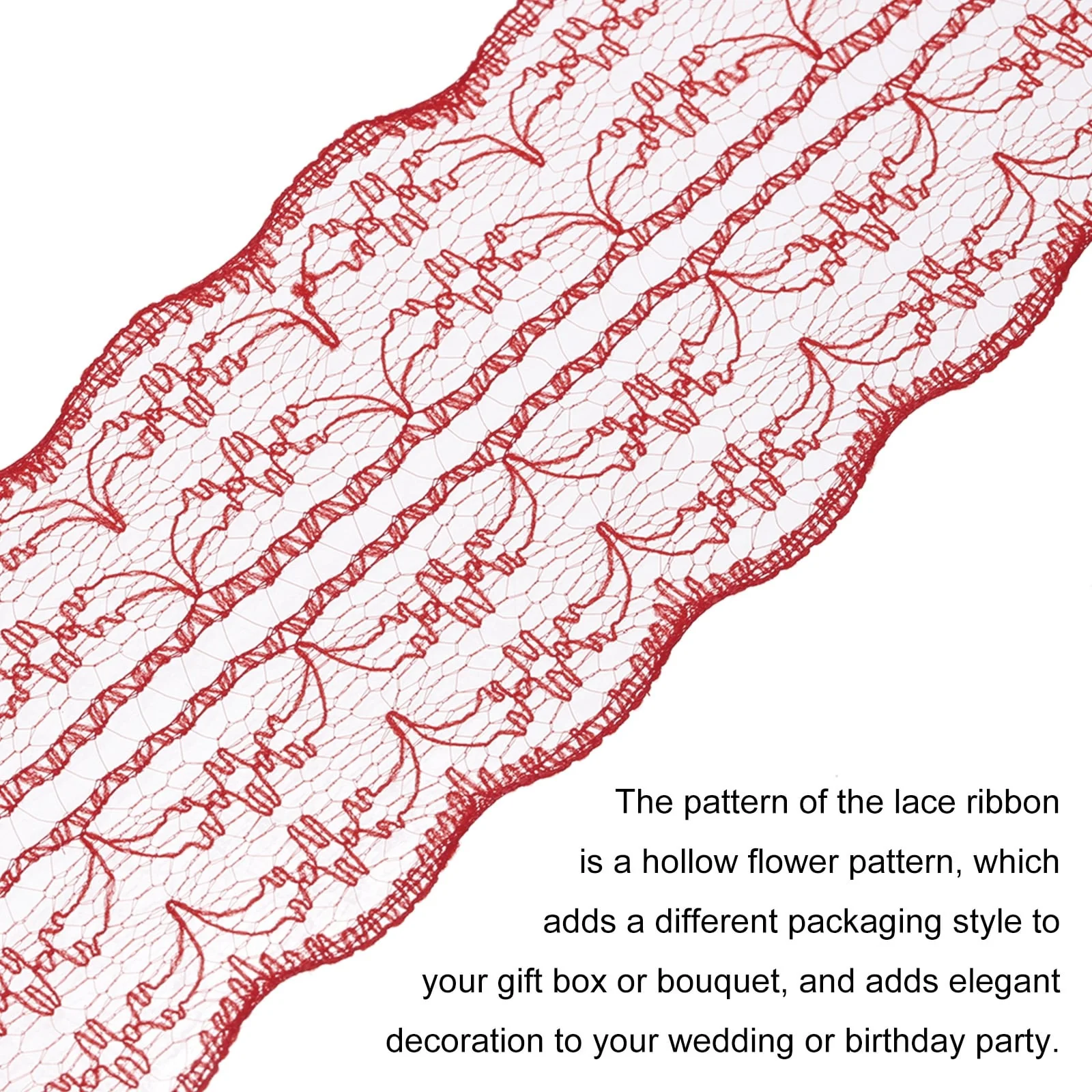 1. The pattern of the lace ribbon is a hollow flower pattern, which adds a different packaging style to your gift box or bouquet, and adds elegant decoration to your wedding or birthday party.