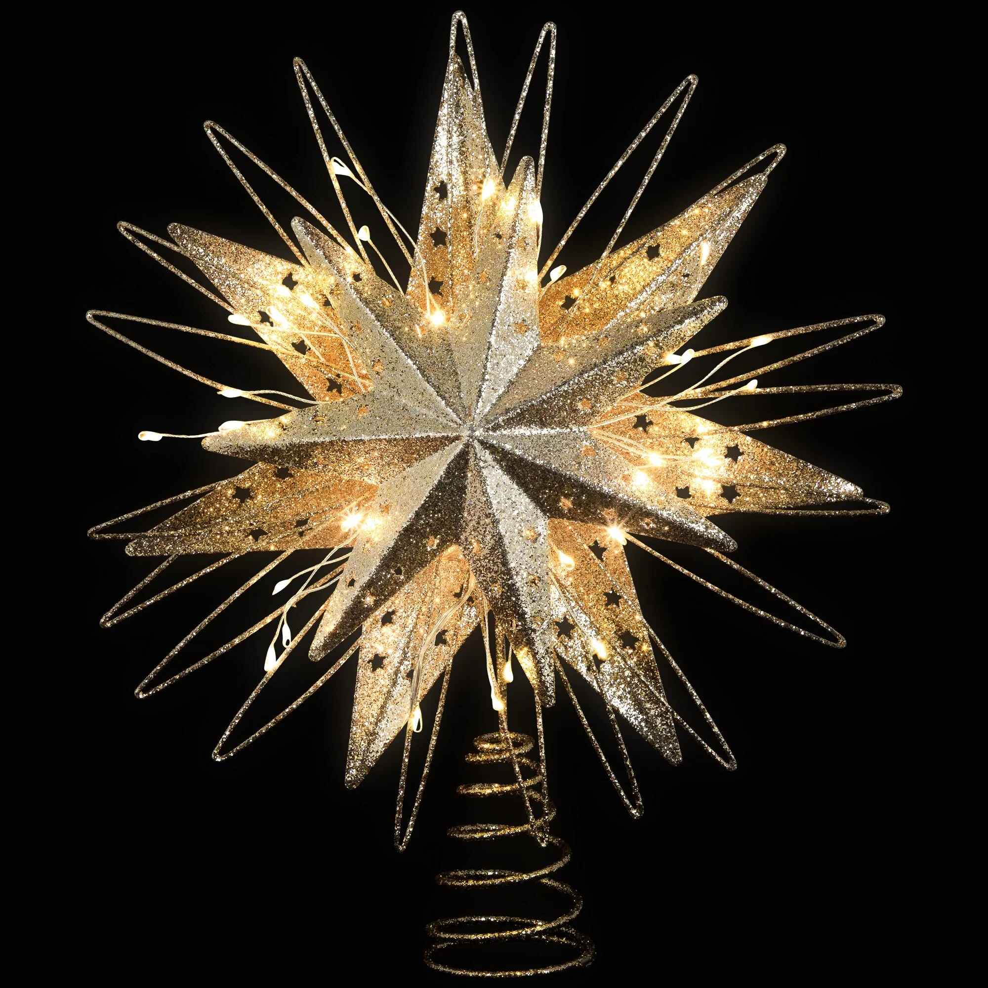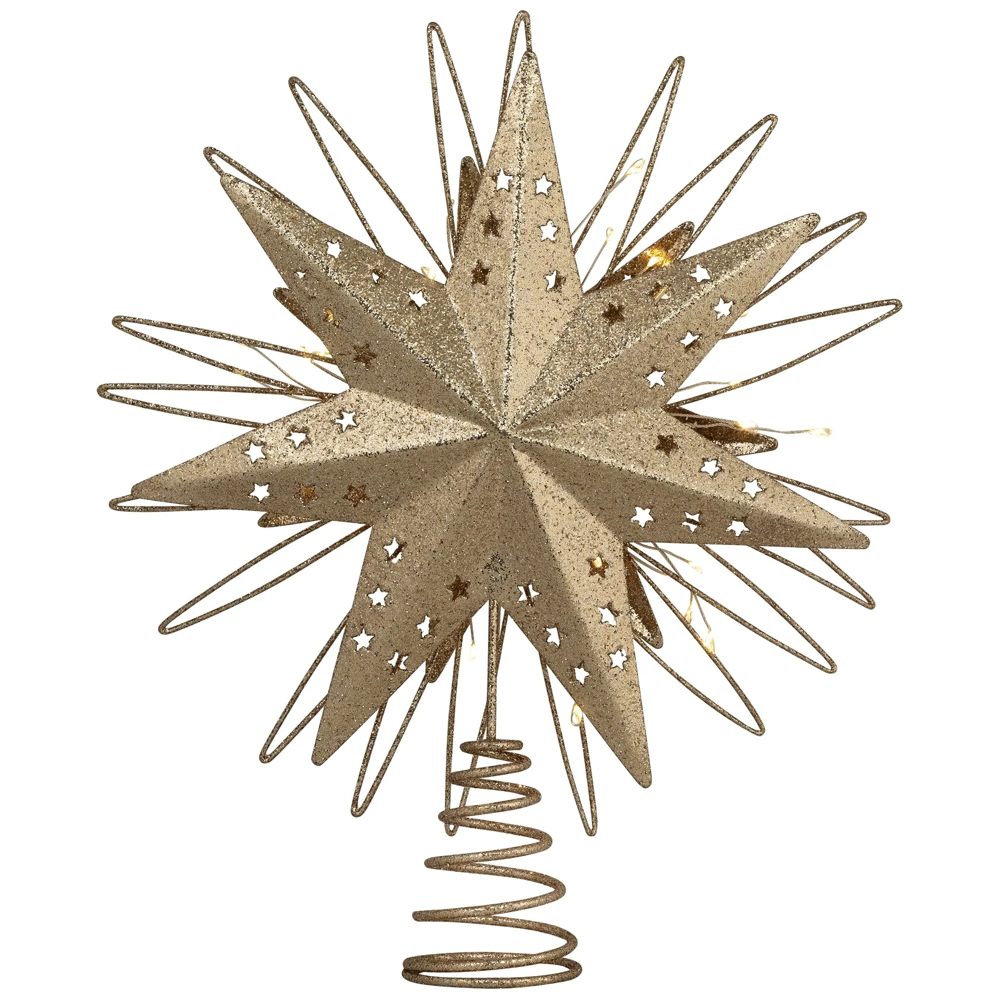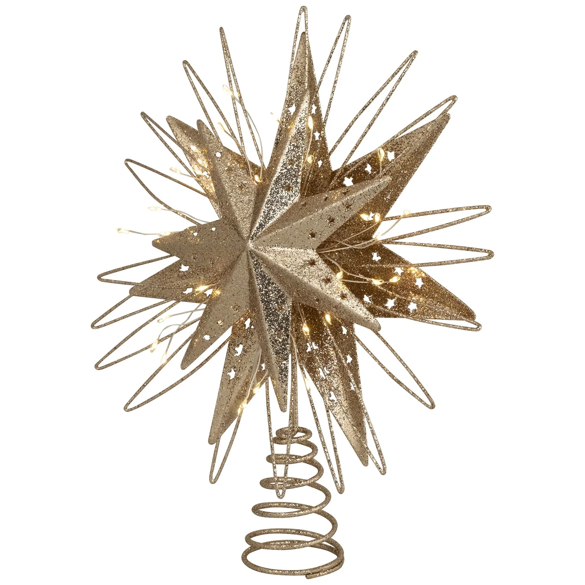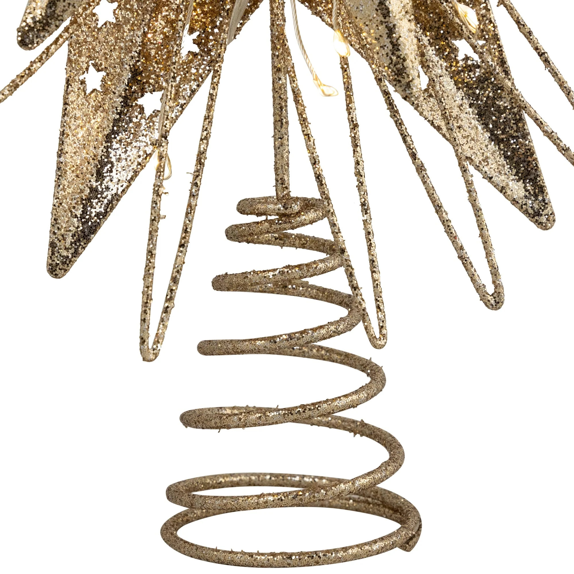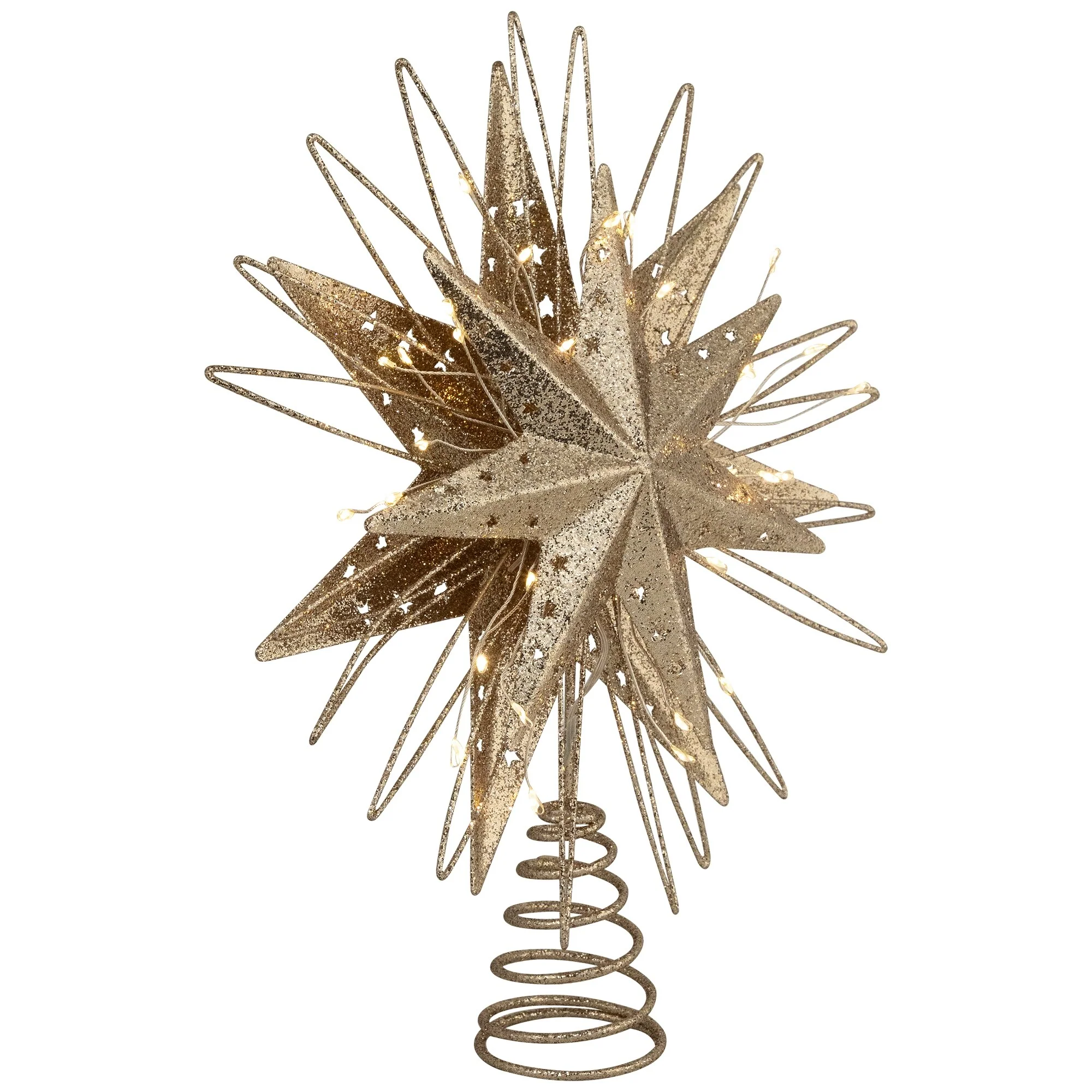 Make your tree the star of the show this Christmas. This champagne gold tree topper features a starburst design with shimmering with glitter. Pre-lit with warm white LED lights, it casts a magical glow that fills your home with Christmas cheer. Elevate your tree to new heights with this beautiful tree topper that blends classic charm with modern elegance. Perfect for creating a magical atmosphere that will be the highlight of your holiday season.