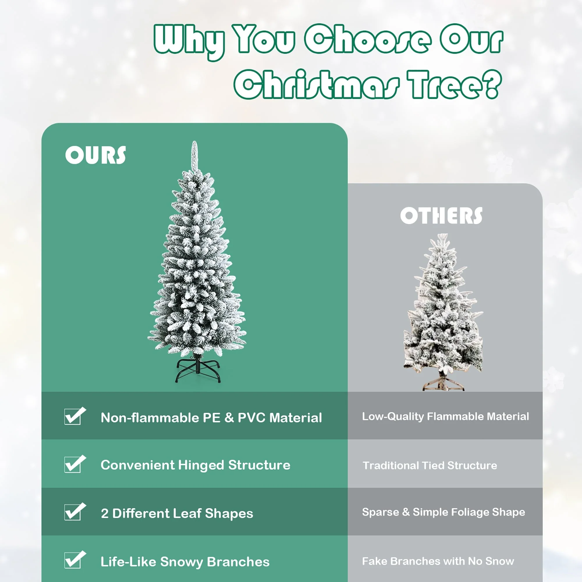 Create a strong festive atmosphere and wintry vibe in your home with this 4.5ft Snow-Flocked Hinged Artificial Christmas Pencil Tree. The snow-flocked design showcases beautiful wintry scenes in nature, while the plentiful branch tips create a luxurious appearance. With 373 branch tips in two different leaf shapes, this tree creates a natural gradation. Made with premium PVC and PE materials, this tree stands out from inferior options. The hinged structure makes assembly a breeze, and the folding metal stand ensures high stability for the entire season. Personalize the tree by hanging ornaments on the branches. This eye-catching indoor decoration is perfect for both residential and commercial use. Have a happy holiday time with your family and enjoy the coming joyful Christmas.