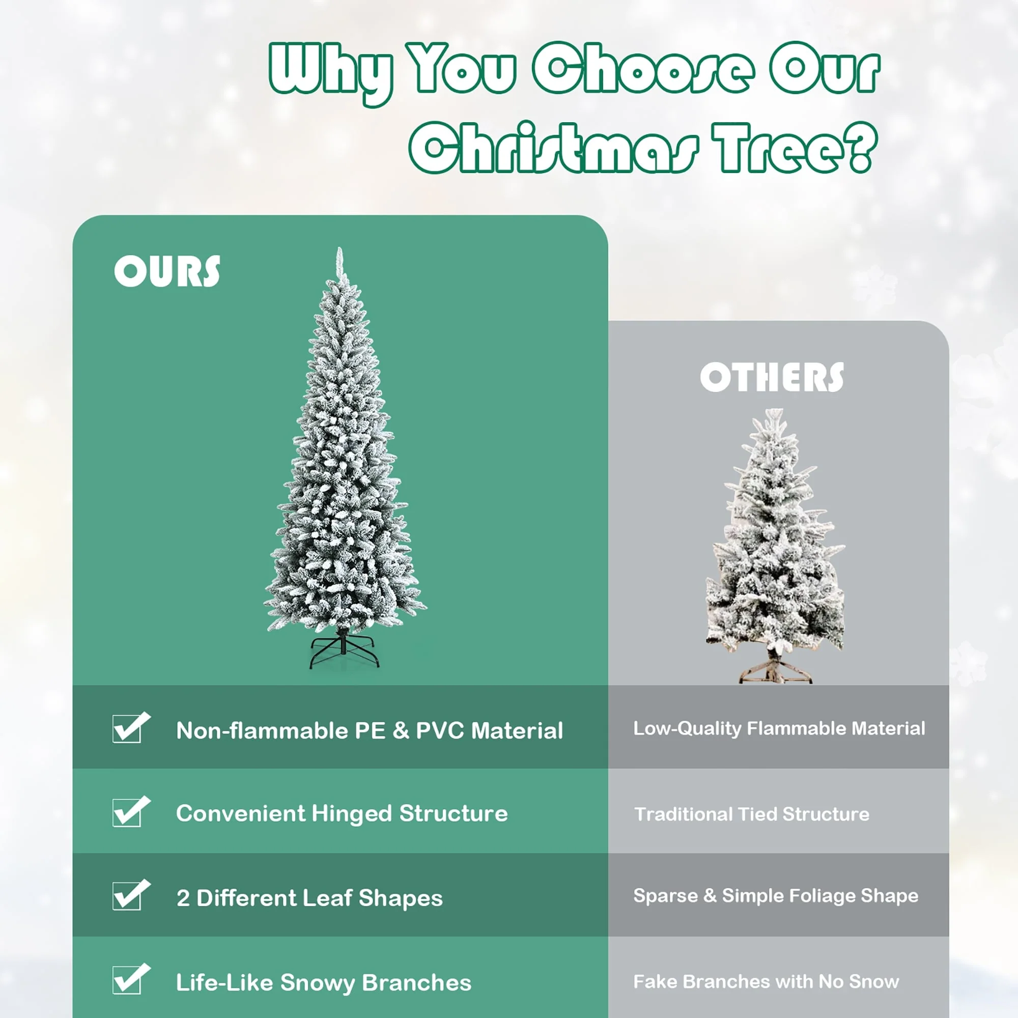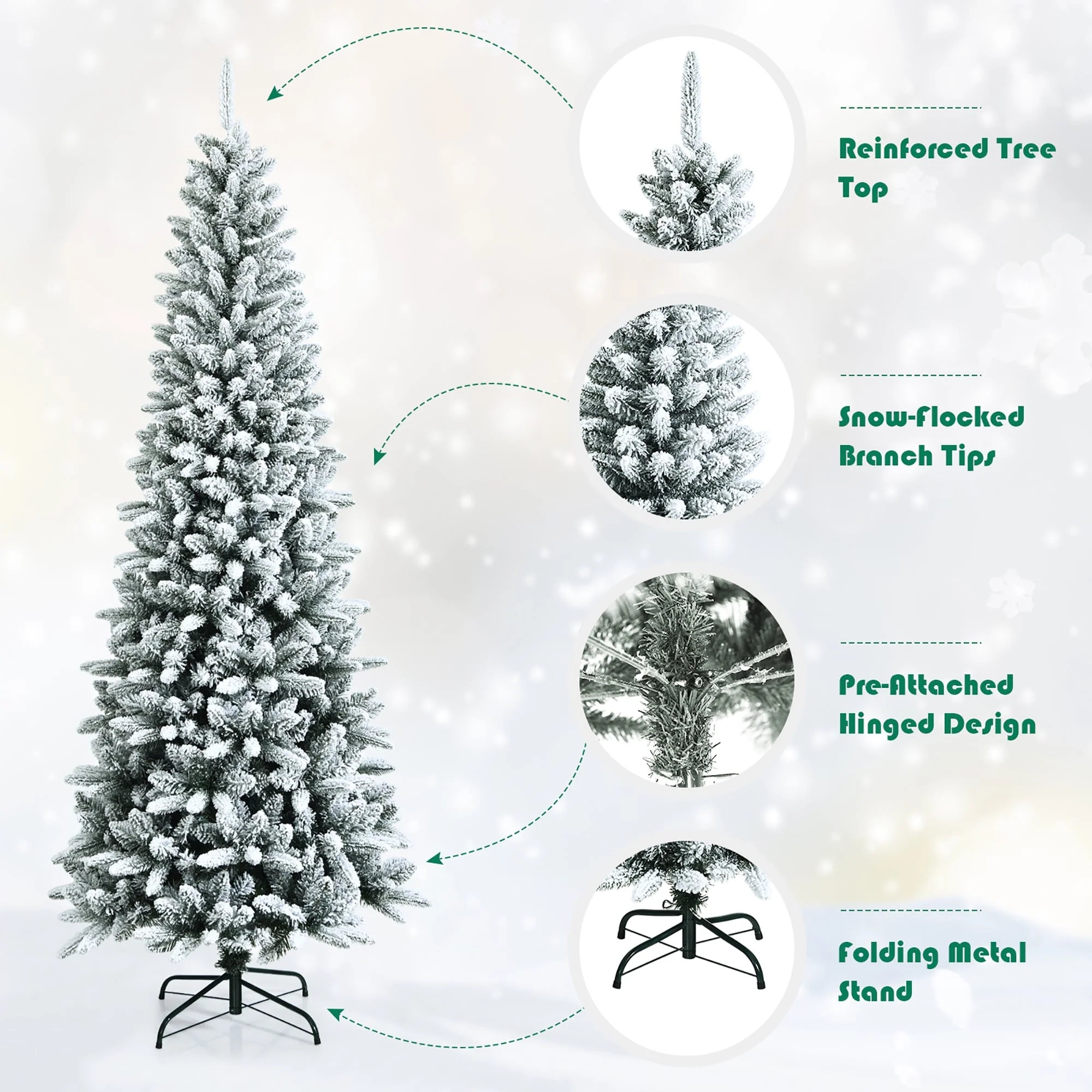 Create a strong festive atmosphere and wintry vibe in your home with this 7.5ft Snow-Flocked Hinged Artificial Christmas Pencil Tree. With 1189 branch tips in two leaf shapes, this tree creates a natural gradation and a flourishing, luxuriant appearance. The snow-flocked design showcases wintry scenes in nature, adding a touch of elegance to your holiday decor. Made with premium PVC and PE materials, this tree stands out from inferior options and is built to last. The hinged structure allows for easy assembly, while the sturdy metal stand ensures high stability throughout the season. Hang your favorite ornaments to personalize the tree and create a joyful Christmas display.