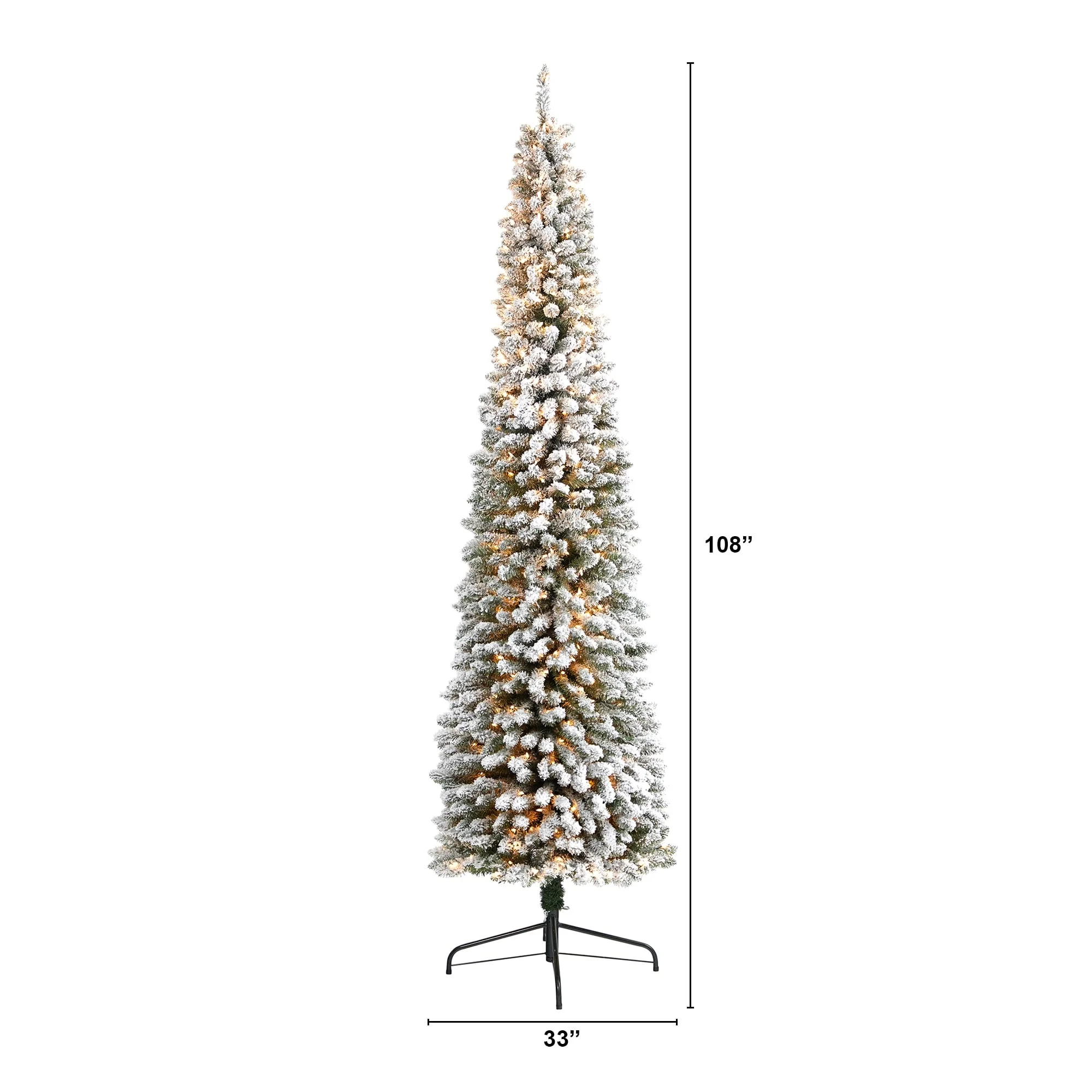 Bring the holiday spirit to any small space with this pencil flocked artificial Christmas tree. With its narrow, pencil like design and flocked with faux snow, this tree evokes the ultimate winter setting. Featuring 896 bendable branches to showcase holiday ornaments, pre-lit with LED lights to eliminate tangles, and stabilized on a stand, this tree is perfect for space saving situations and ensures your home is picture perfect all season long.