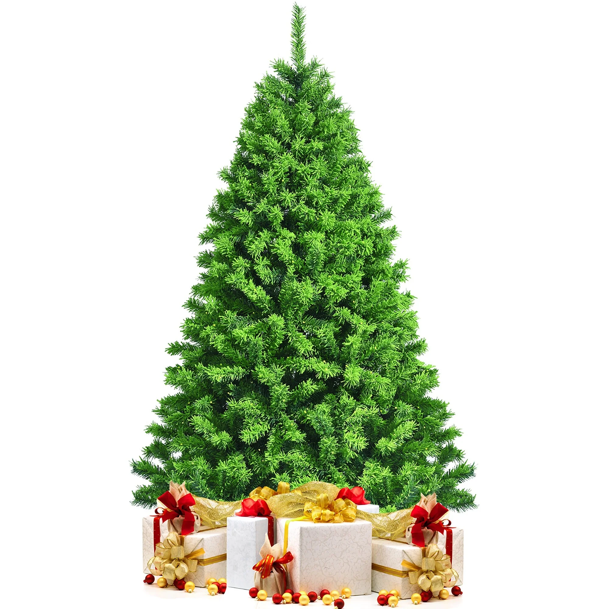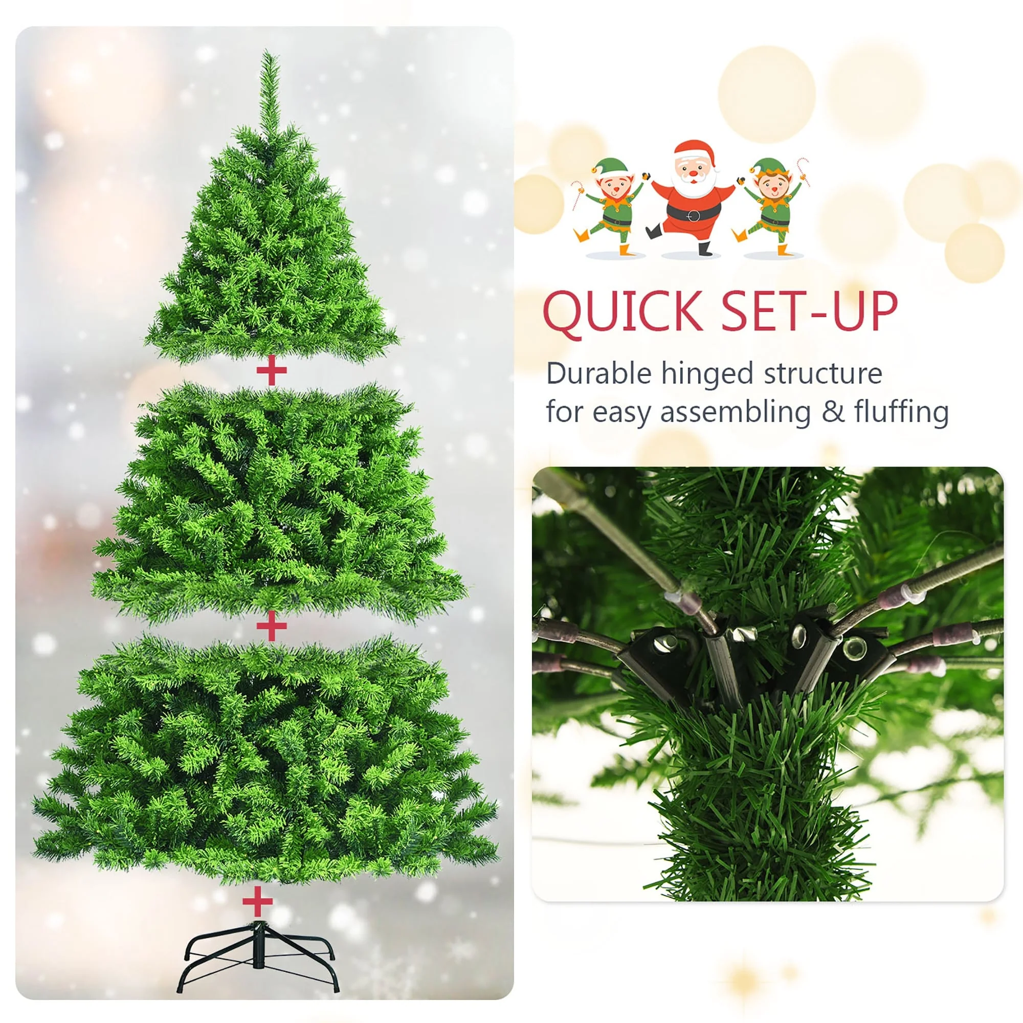 Bring the vividness of a realistic Christmas tree into your home with our Costway 6.5ft Green Flocked Hinged Artificial Christmas Tree. This charming tree features verdant leaves with a flocked design, creating a flourishing and dense appearance. With 924 branch tips, you can easily add extra ornaments for a wonderful festival effect. The tree is made of premium PVC, ensuring lasting durability and easy maintenance for reuse in the following years. The hinged sections make assembly quick and convenient, while the sturdy metal stand keeps the tree stable throughout the entire season. Get ready to spread the strong festival vibe with this eye-catching decoration and have a happy holiday time.