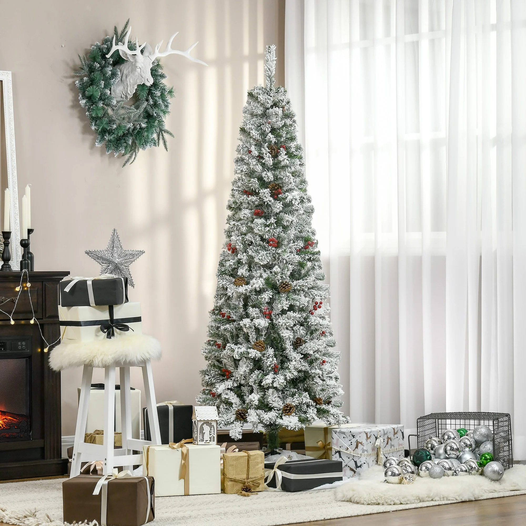 Elevate your holiday celebrations with the 6' Pencil Snow Flocked Artificial Christmas Tree. This stunning tree features 600 realistic branches adorned with vibrant red berries and pine cones, giving it a festive flair while eliminating the need for regular maintenance. Enjoy the beauty of winter in your home with this elegantly designed tree.