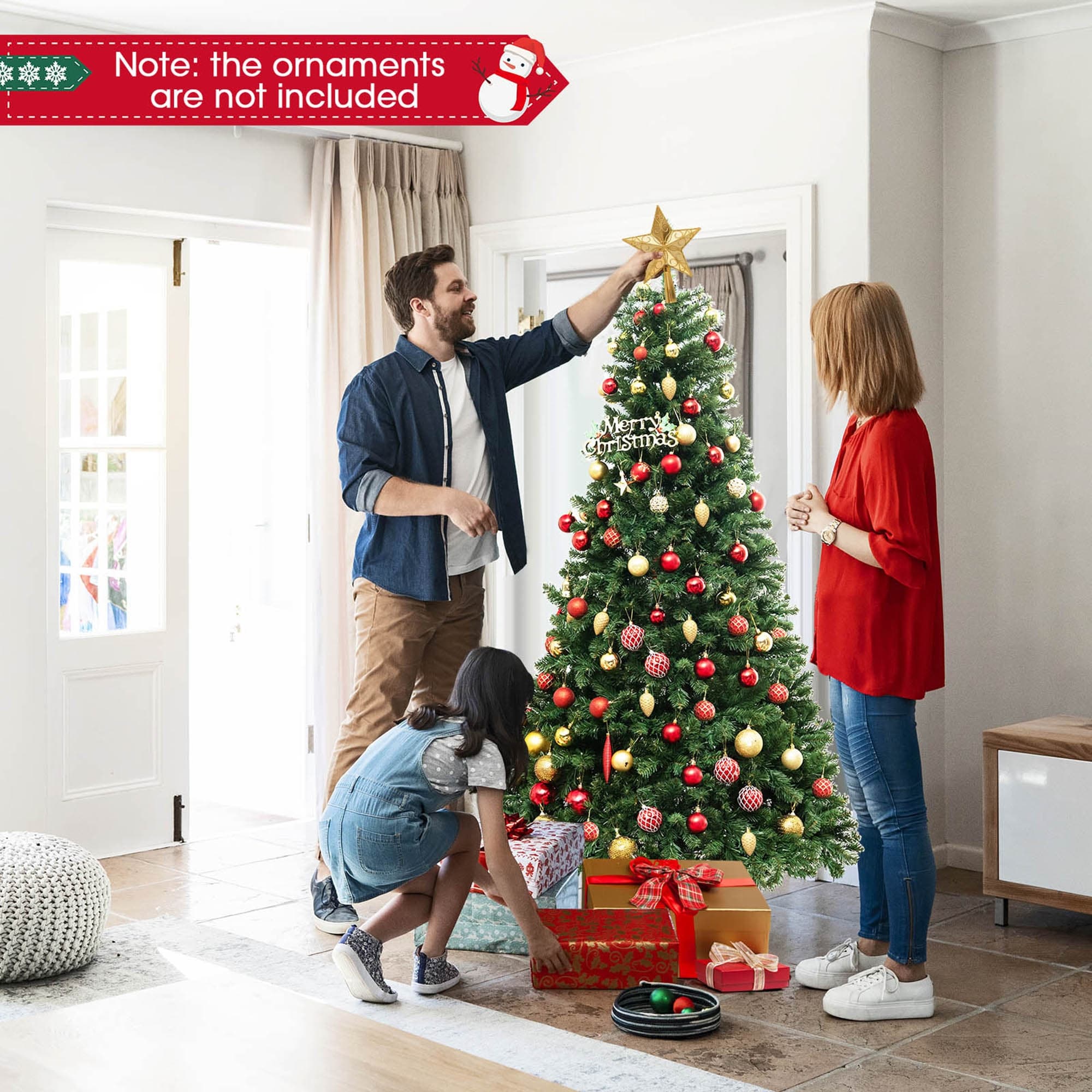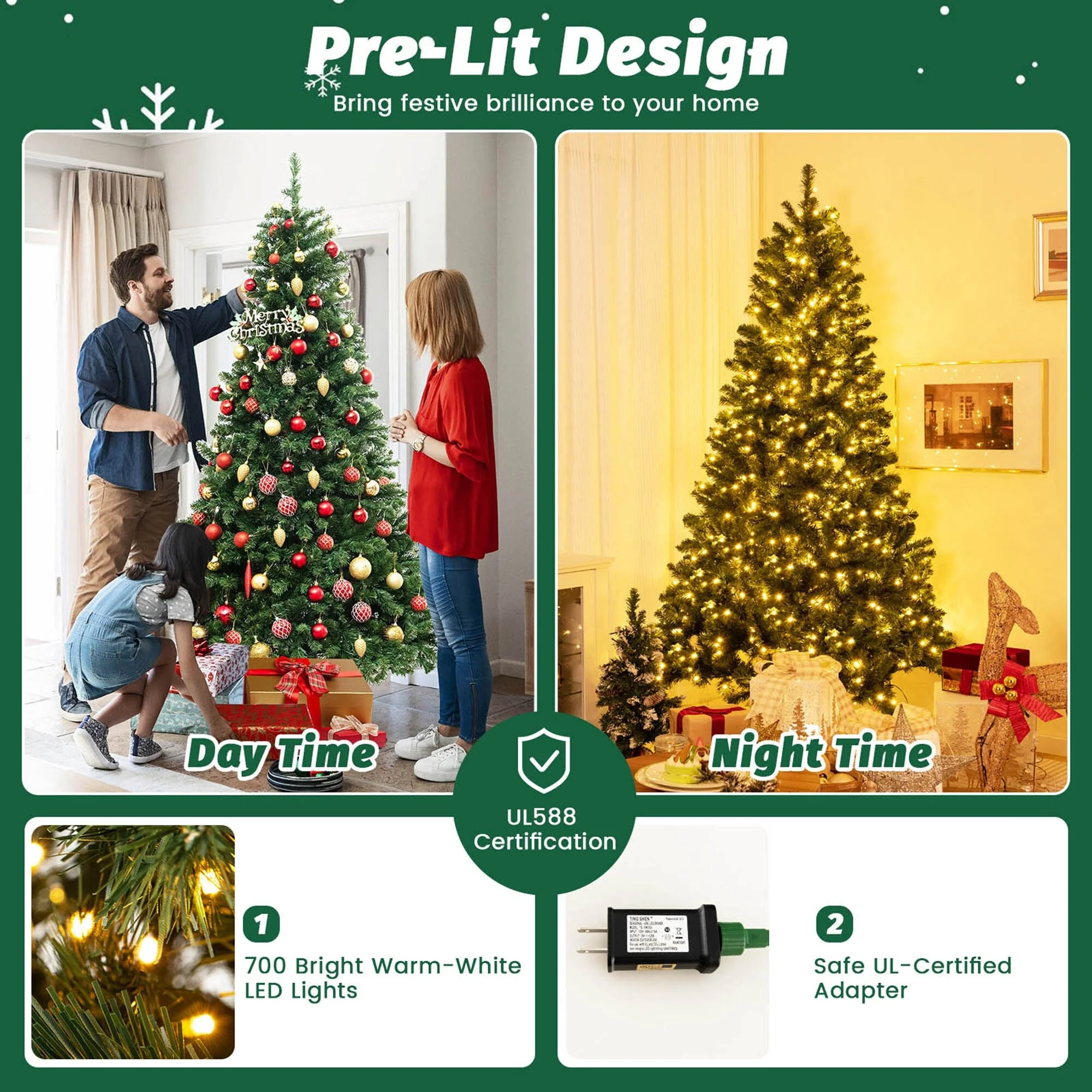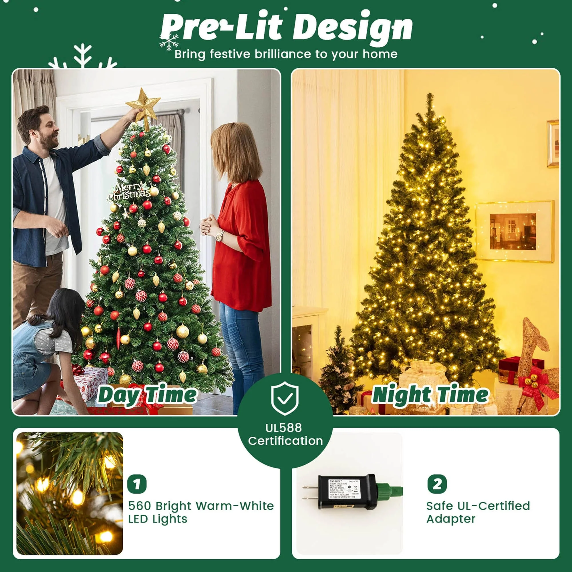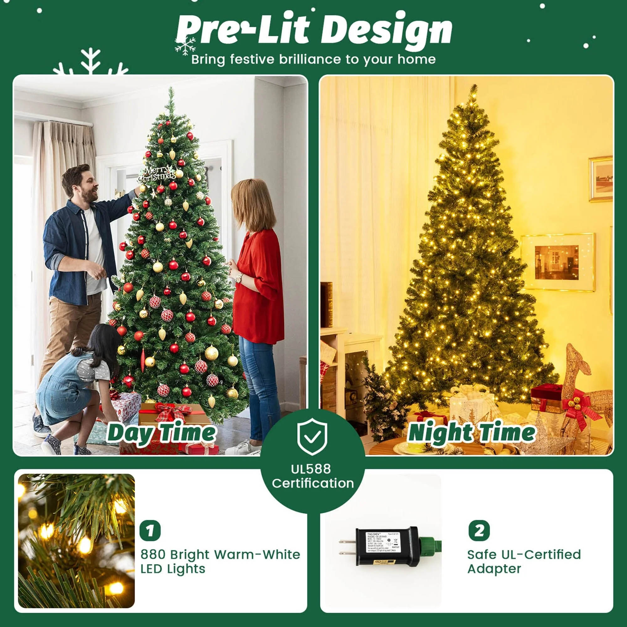 Wish You a Happy & Warm Festive Time!Our luxurious pre-lit artificial Christmas tree can be a perfect choice for adding a touch of magic to your holiday season. With its 821/1188/1498 dense branch tips, our tree offers a visually impressive display, creating a lush and vibrant backdrop for your holiday decorations. Whether placed in your living room, office, or any other space, it effortlessly enhances the festive ambiance and brings a sense of joy and warmth to the surroundings. Moreover, equipped with 560/700/880 warm-white LED lights, the tree can also bring festive brilliance to your home.