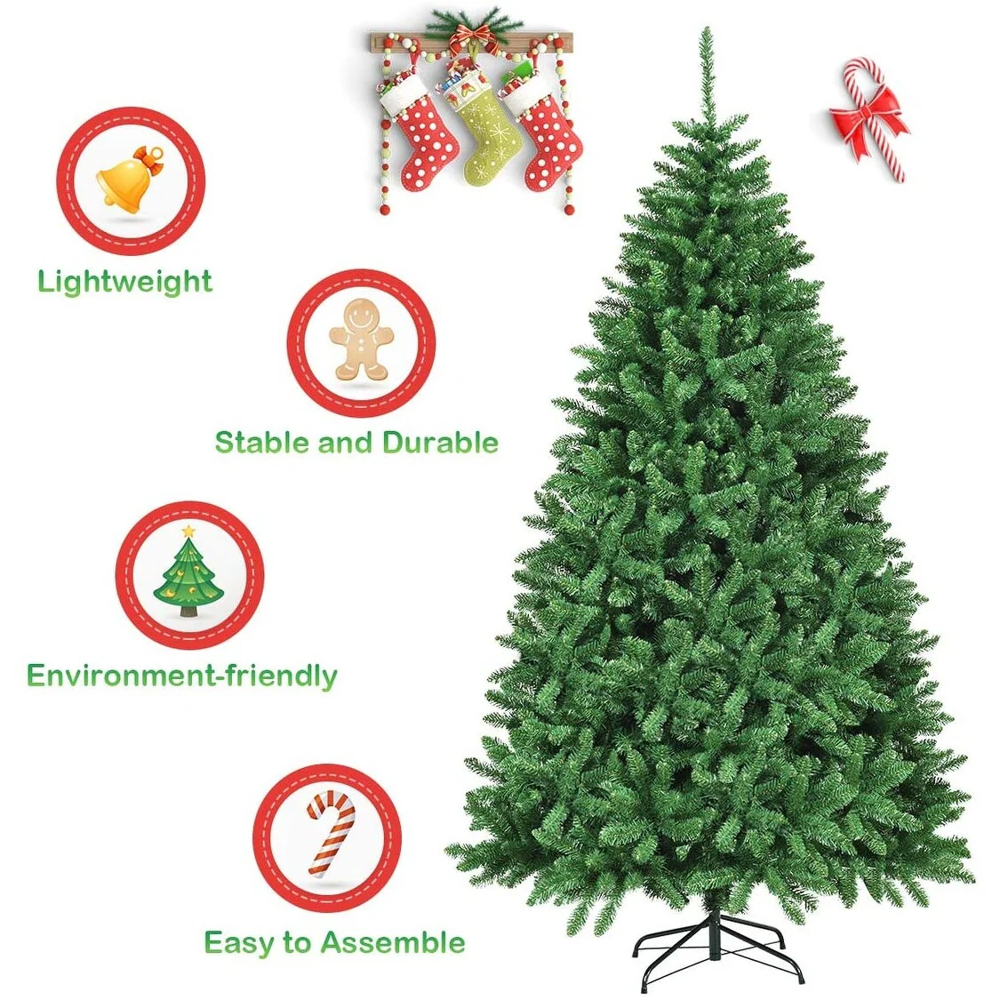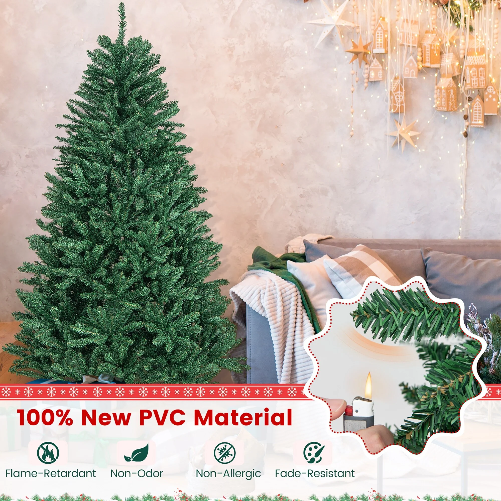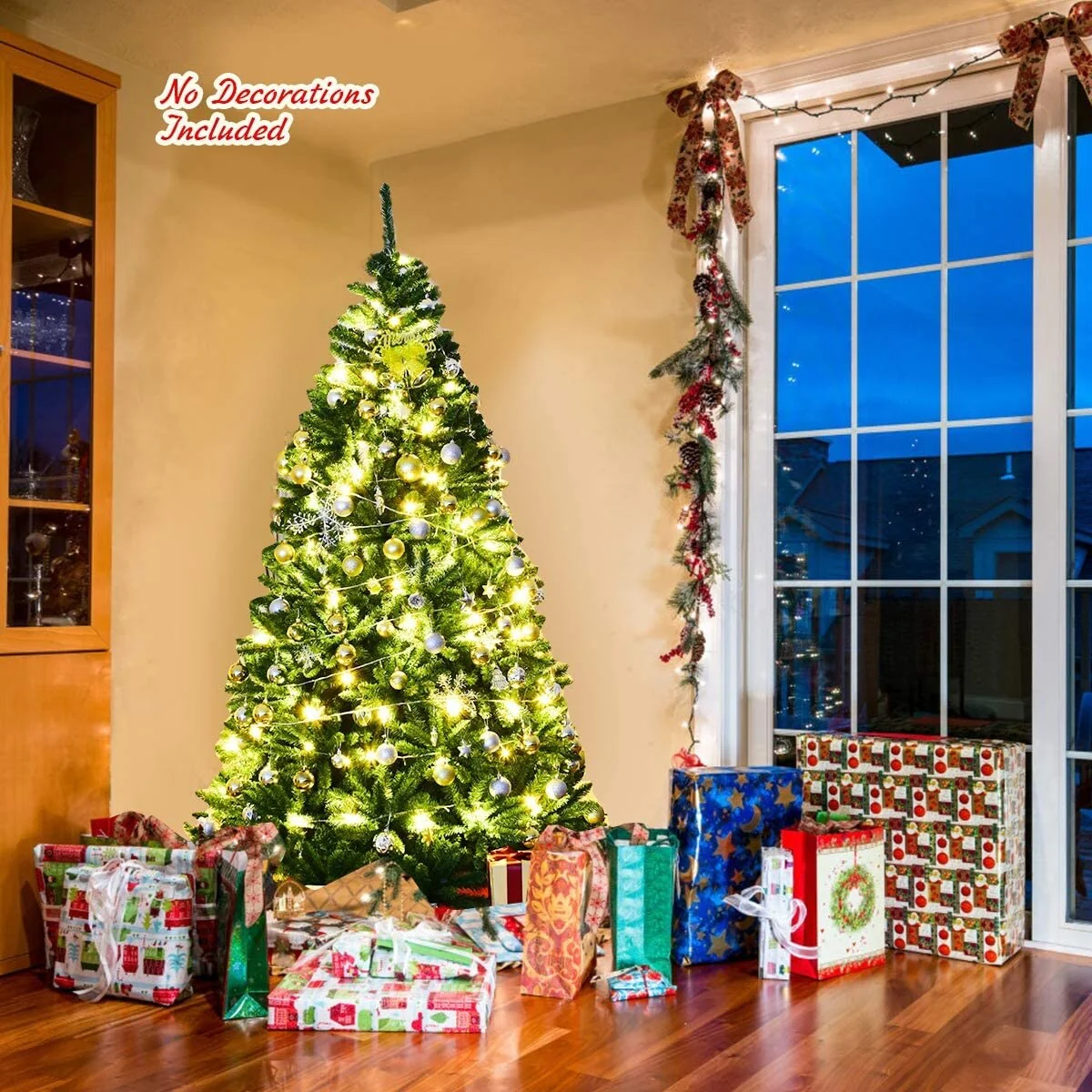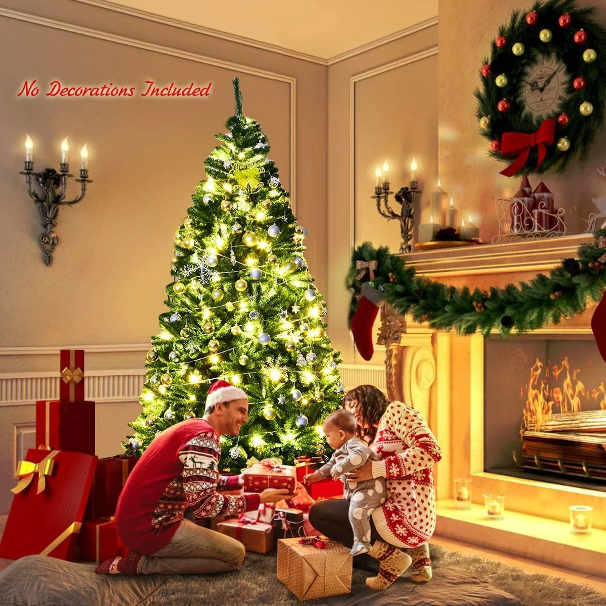 There's no extra holiday decorations provided on this unlit Christmas Tree with full and plush appearance. You can use your imagination and unite your family and friends together to decorate the Christmas tree, which is more meaningful and impressive.The needles of this Christmas tree are made of premium environment-friendly PVC, which is absolutely safe to use and makes it look more real. Besides, many branch tips and simple green color will help emulate a real Christmas tree.