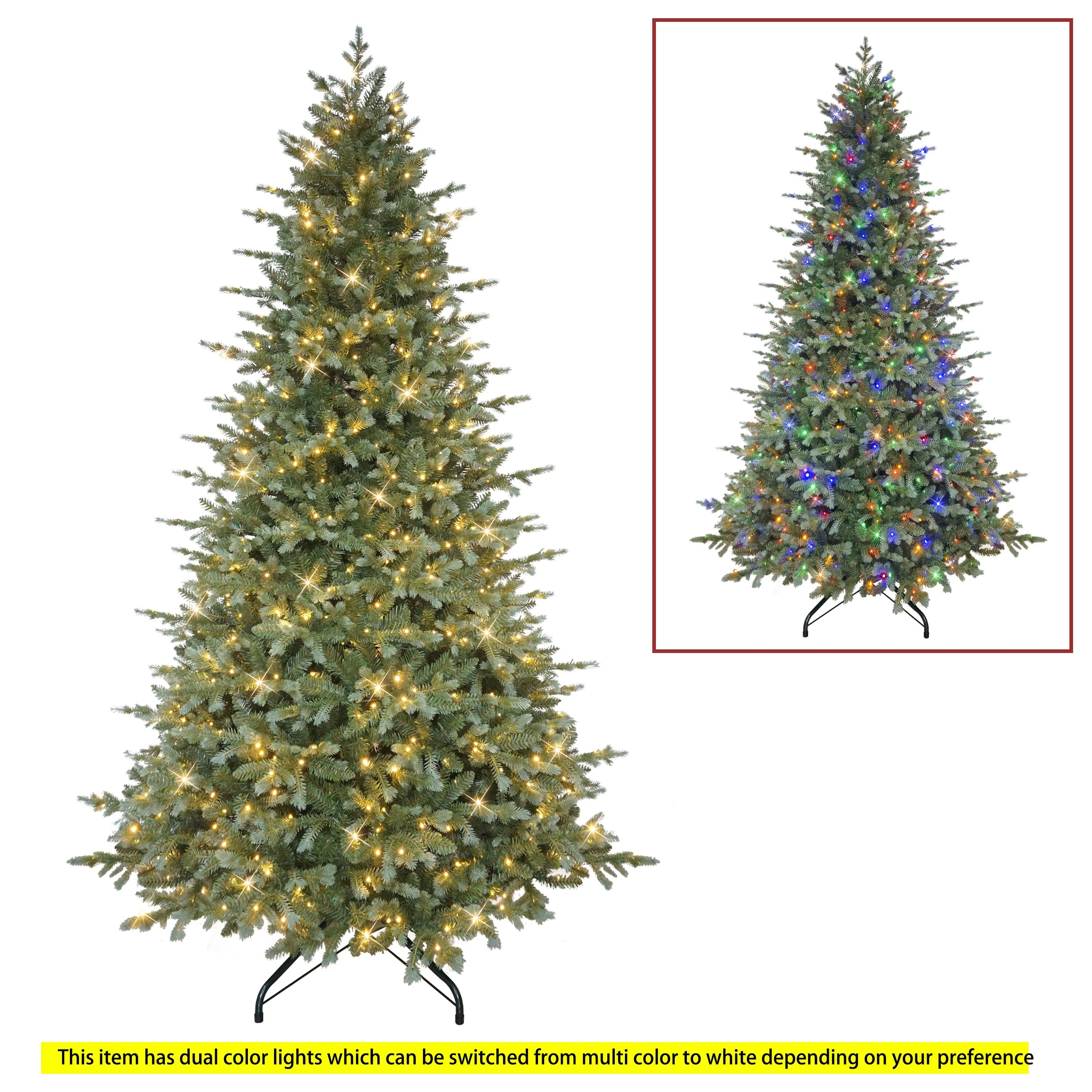 • 9 ft. PRE-LIT ARTIFICIAL LINDEN FIR BLUE/GREEN TREE: Features 750 Dual-Color Multi-Function LED lights that create a cozy, inviting holiday glow with your choice of 9 different functions to switch between with a convenient foot pedal for easy use.