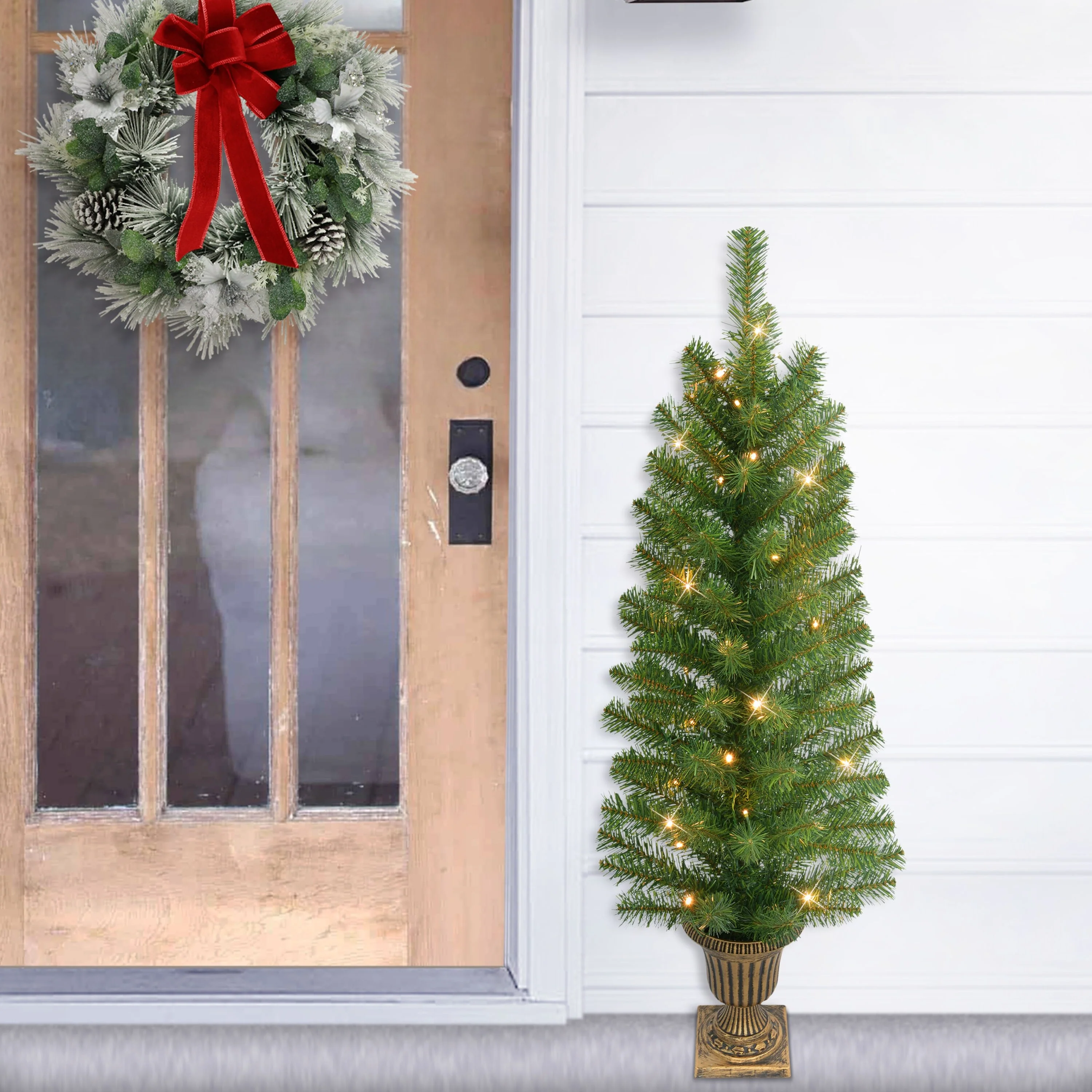 - SET OF 2 ARTIFICIAL BATTERY-OPERATED TREES: Features A total of 35 Warm White LED Lights that create a cozy, inviting holiday glow. The lights are already integrated, so there is no need for extra installation and comes with an 8-16 hour on/off timer for your convenience. Please note: 4 AA batteries are not included with Puleo International Set of 2 3.5' Artificial Battery-Operated Pre-Lit Potted Christmas Trees.