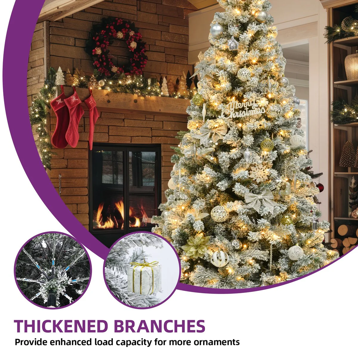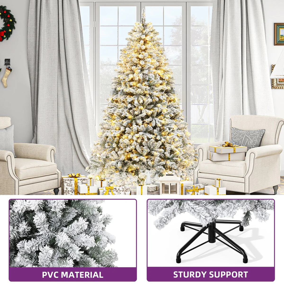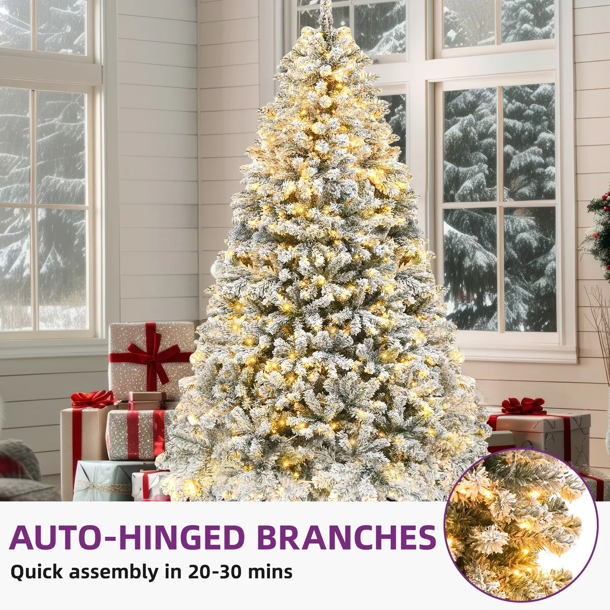 Elevate your holiday decor with our 6ft Snow Flocked Artificial Christmas Tree. Featuring 800 adjustable branch tips and 250 pre-installed lights with 8 modes, this tree offers a vibrant and personalized festive touch. Easy to assemble with hinged branches, it also boasts a durable X-shaped iron stand for stability. Ideal for homes, weddings, and commercial spaces, it's ready for your unique decorations.