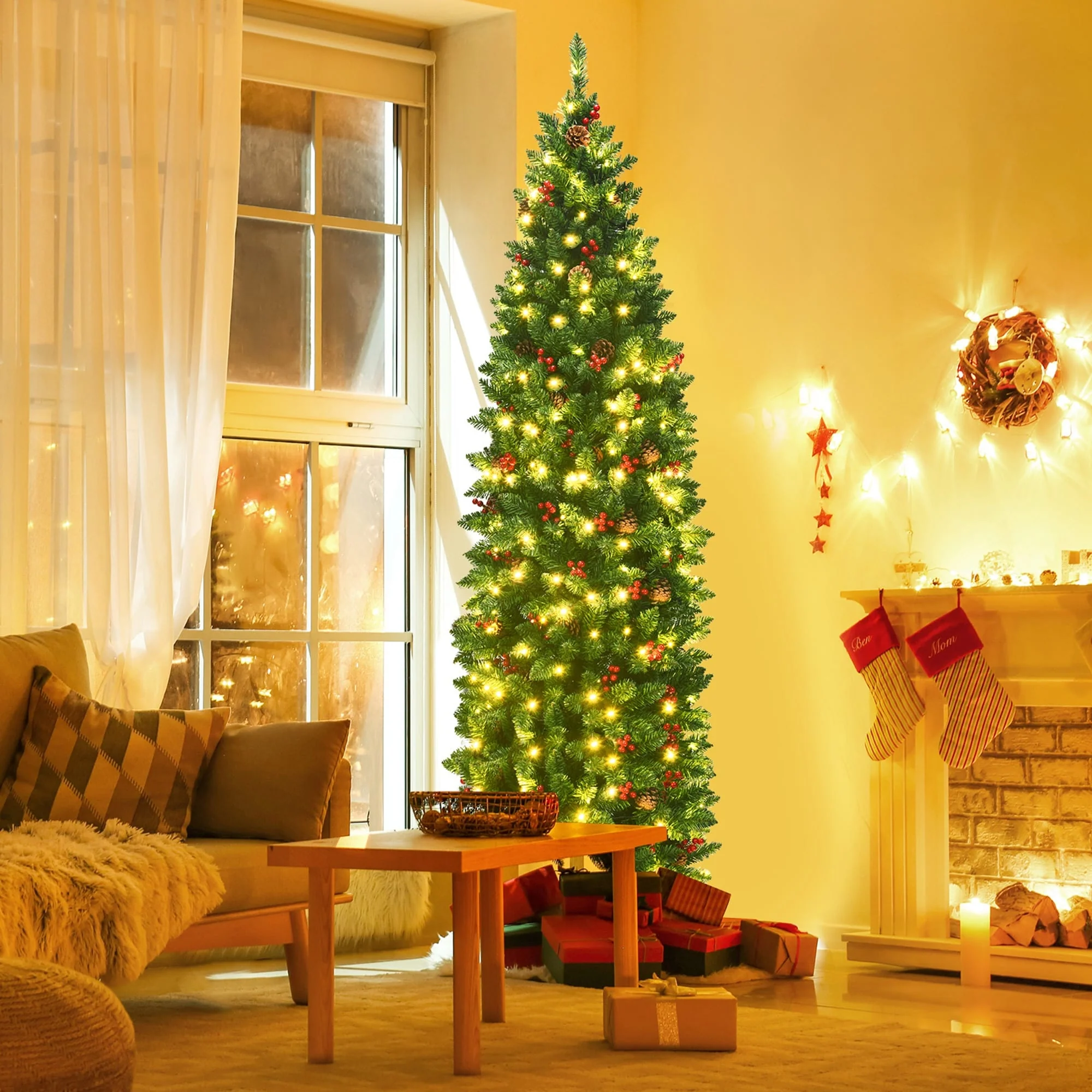 Gymax 6.5Ft Pre-Lit Pencil Christmas Tree Hinged Artificial Slim Tree - See Details
