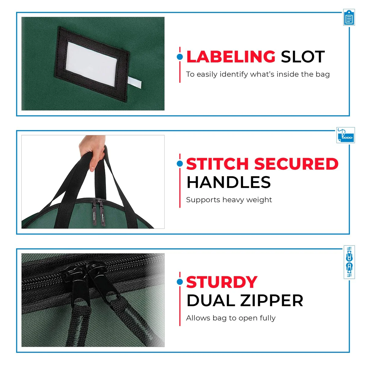 - HANDY FEATURES-Positioned on the inside, you will find two wreath-securing Velcro straps, preventing the wreath from moving about and losing its form and shape. Located on the forefront of the bag is a name tag for immediate recognition of the interior, saving you the trouble of opening and closing each one separately.