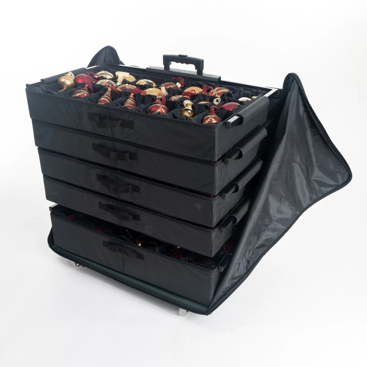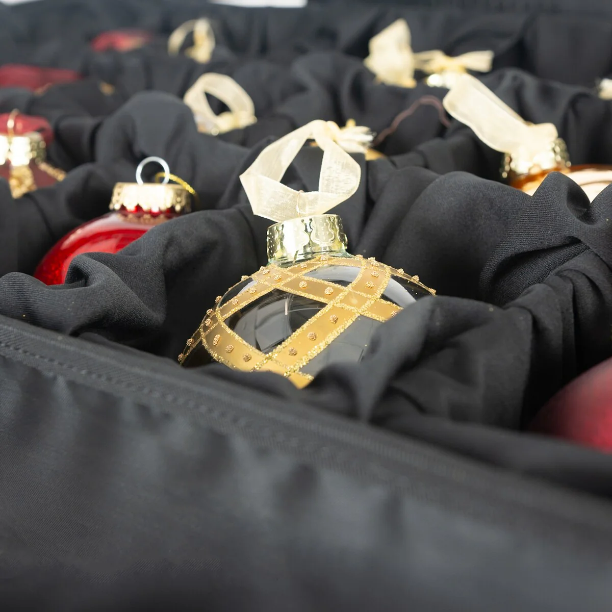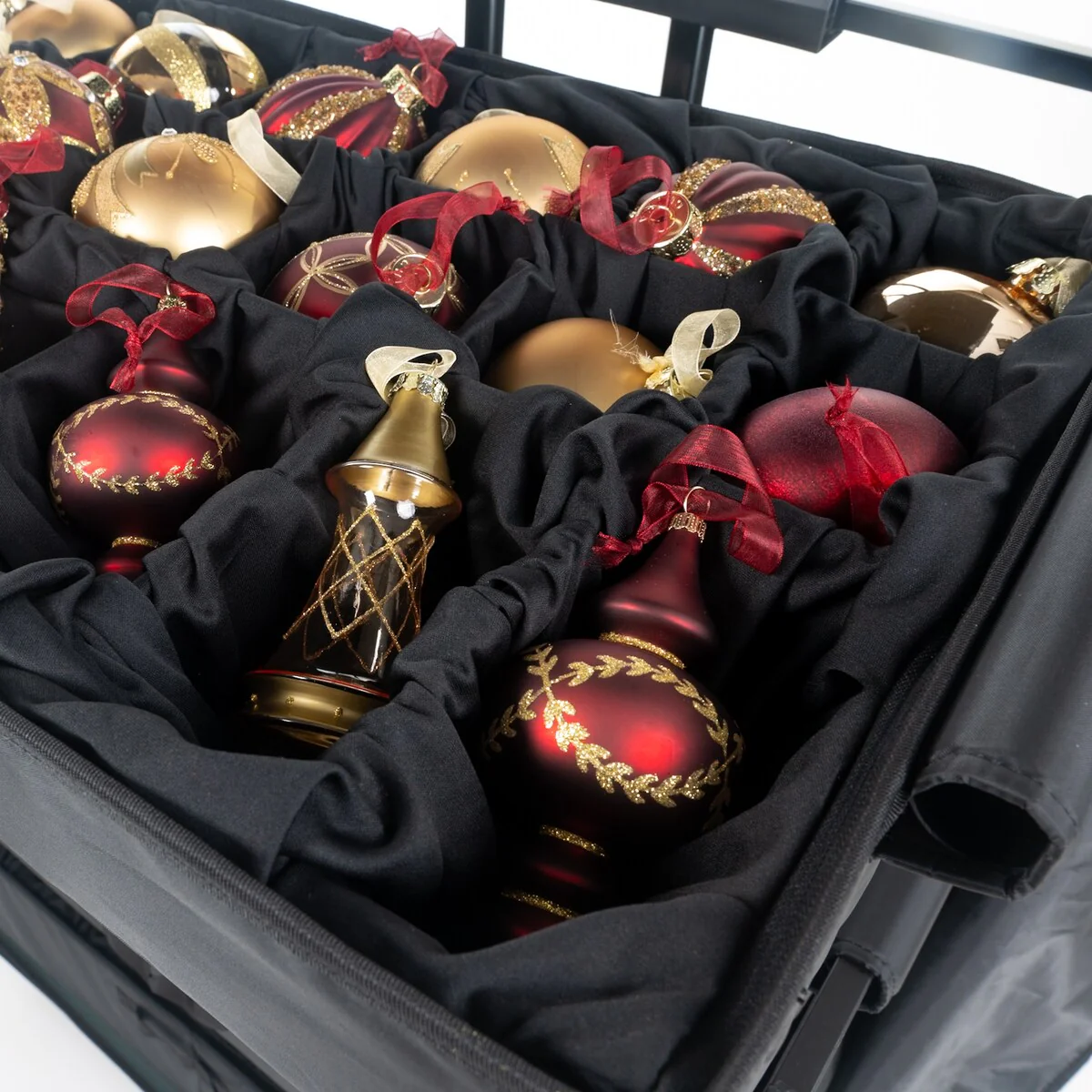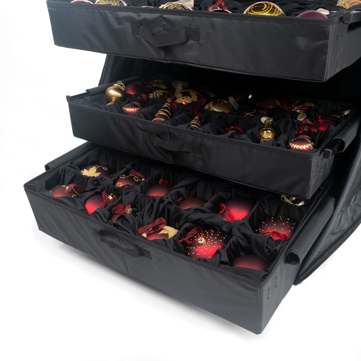 Wrapping your precious ornaments in newspaper and piling them in a plastic bin for storage is a recipe for disaster. If not properly cared for, your irreplaceable ornaments will either be crushed or be discolored by the acid found in the very paper wrapped them in for protection. We understand it’s hard to store all your ornaments in one place while keeping them from breaking, especially the odd-shaped ones. That’s why we designed this Adjustable tray Rolling Christmas ornament storage container. The Telescoping Adjustable Christmas Ornament Storage Box with wheels holds up to 140 ornaments that are 4 in. tall, by nearly any width and length, thanks to the adjustable dividers in each tray. The 5 removable trays are lined with acid-free, plush velor fabric that hang from the adjustable rods, creating air cushions that keep your ornaments well protected against bumping into each other. Each Christmas ornament organizer tray is completely removable for easy decorating around the tree. The trays attach to a telescoping stand to raise them up to a taller height, preventing you from having to lean over so far and causing back pain. Protect your irreplaceable Christmas tree ornaments to ensure a lifetime of use. A Patented Product: Patent(s) 10,322,737 and 10,589,768