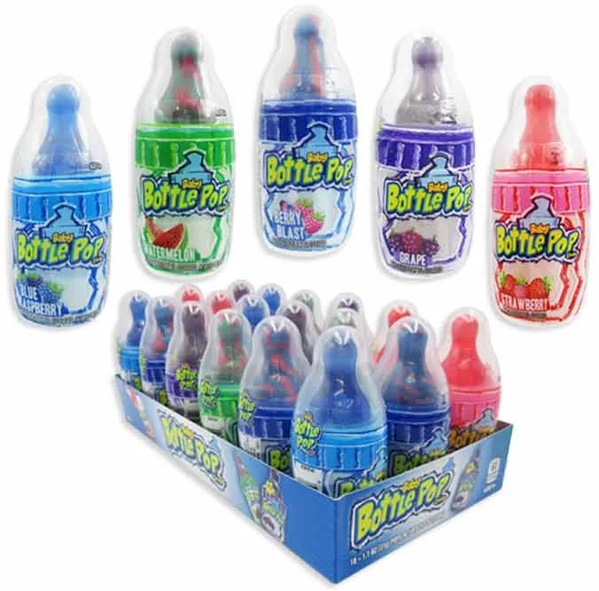 Bring out the Baby in You with Baby Bottle Pop, in loads of delicious flavors! Original comes in Cherry, Watermelon, Sour Blue Raspberry, OR try Rainbow Sherbet, Berry Blast, Strawberry/Watermelon, and Tropical Punch - they're Twisted. For a fun surprise, try a Mystery Baby Bottle Pop with color changing powders. Can you guess what the flavor is?