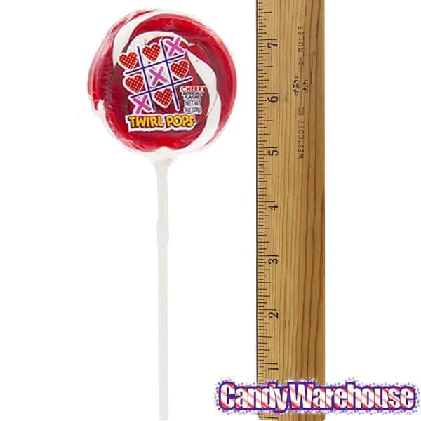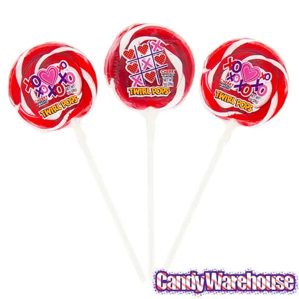 Delicious cherry flavored Twirl Pops in swirling colors of red and white! A sturdy, longer-than-average stick helps you enjoy them without accidentally licking the knuckles or fingers of your hand that holds the stick. Each wrapper features a Valentine heart graphic with a romantic phrase such as "You're Mine," "Love You," and "Kiss."