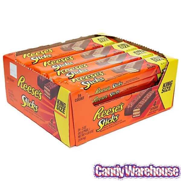 Display box contains 24 Reese's Sticks King Size Candy Bars, each with a net weight of 3 ounces.