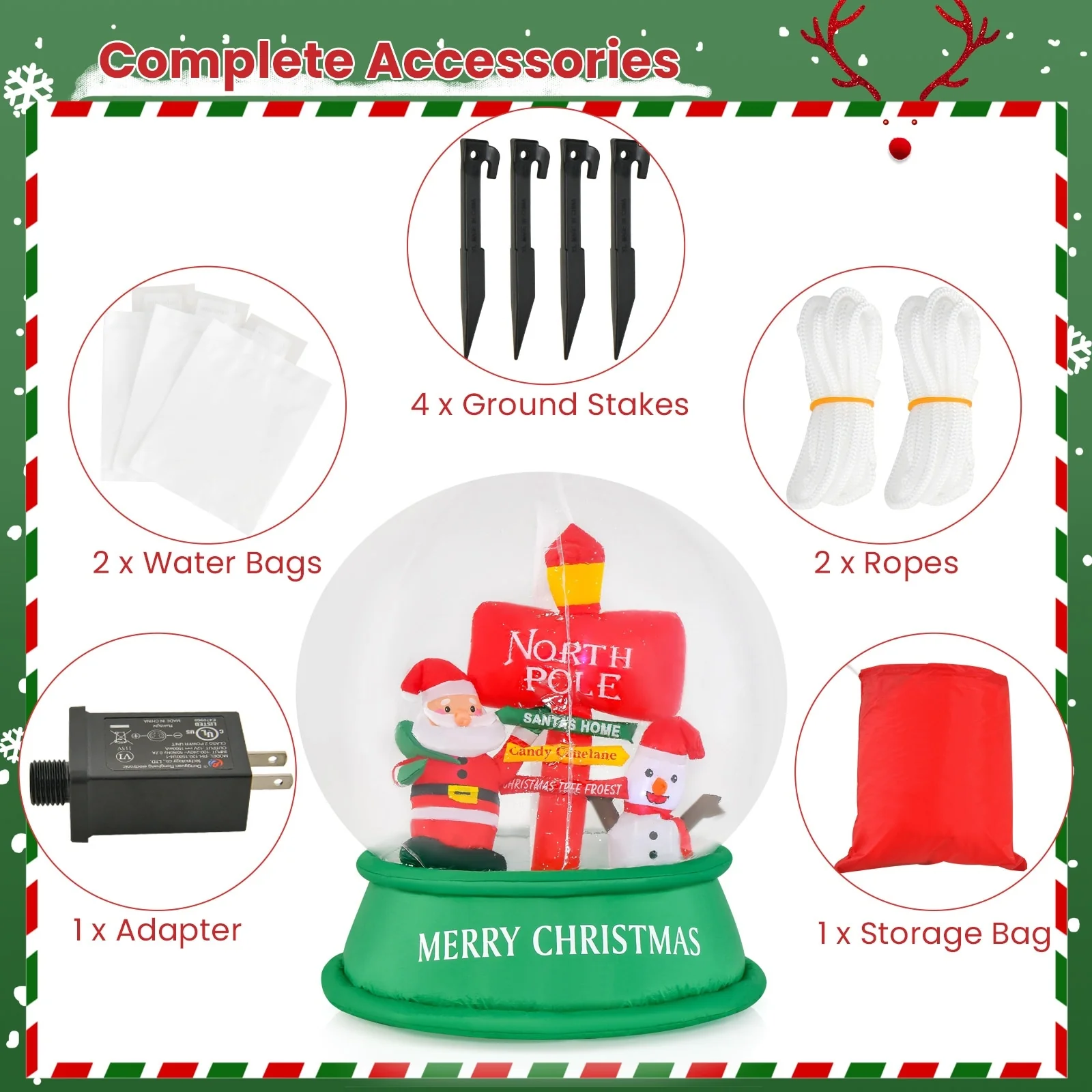 This Christmas decoration consists of Santa, snowman and road sign, which will create a festive focal point in your yard, lawn, party. This lighted yard decoration features 3 bright LED lights for a glowing, lighting effect. This playful blow-up decoration is designed for durability with its premium polyester material. To make it an easy piece for you to set up and break down for storage, this lighted Christmas decoration comes with powerful blower for quick inflation and a storage bag for easy storage. You can put the water bags inside the inflatable, and attach the ropes and insert the ground stakes to increase stability. Enjoy a joyful Christmas with your family with this inflatable Christmas crystal ball!