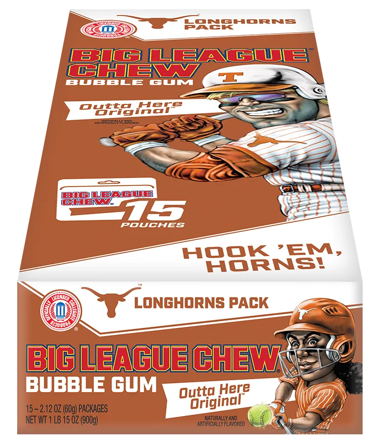 Texas Longhorns fans, this one’s for you! The Outta Here Original flavor of Big League Chew—the legendary shredded bubble gum loved by players and fans for over 40 years—is now available in a special Longhorns edition pack. With its bold flavor and nostalgic charm, this gum is a home run for game day, tailgates, or just showing your Texas pride.