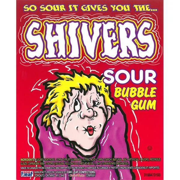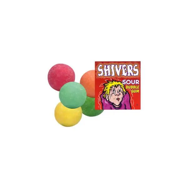 Spine tingling tangy fruit flavors explode from these sour bubble gum that will make you pucker with delight. They're called Shivers for good reason. One chew of this sour gum will have you scrunching your face and trembling from the burst of sour power!