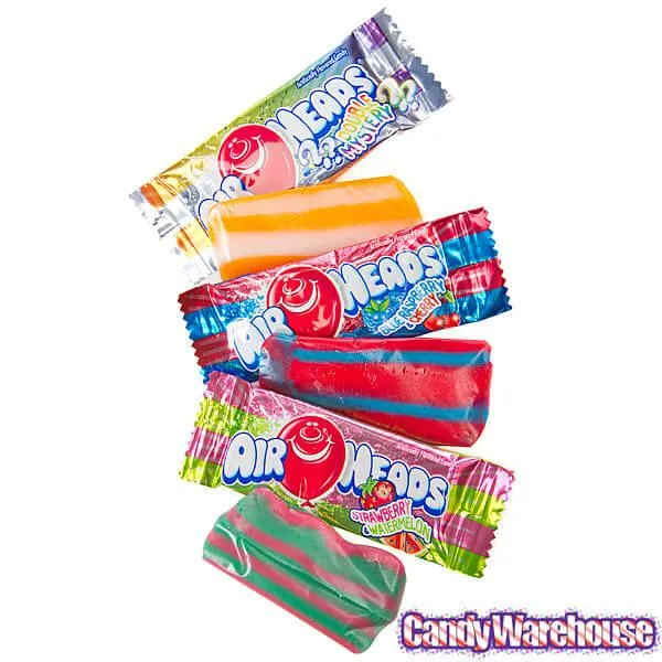 Display box contains 12 packs of AirHeads Striped Taffy Mini Candy Bars.