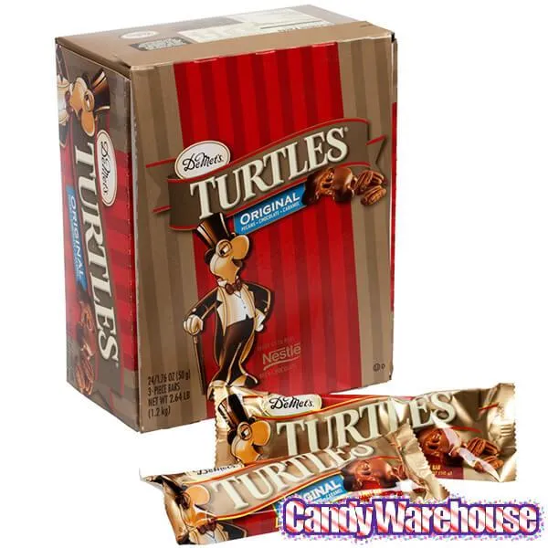 Display box contains 24 three-piece DeMet's Turtles Chocolate Candy Bars, each with a net weight of 1.76 ounces.