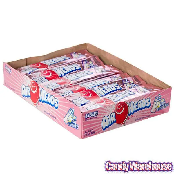Stretchy and chewy taffy bars featuring a tangy pink lemonade flavor!Display box contains 36 Pink Lemonade AirHeads Taffy Candy Bars, each with a net weight of 0.55 ounce.Made in the USA.Shipping Weight ~ 2 lbs. Kosher Certified.