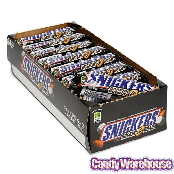 Display box contains 24 Snickers Rockin' Nut Road Candy Bars, each with a net weight of 1.76 ounces.