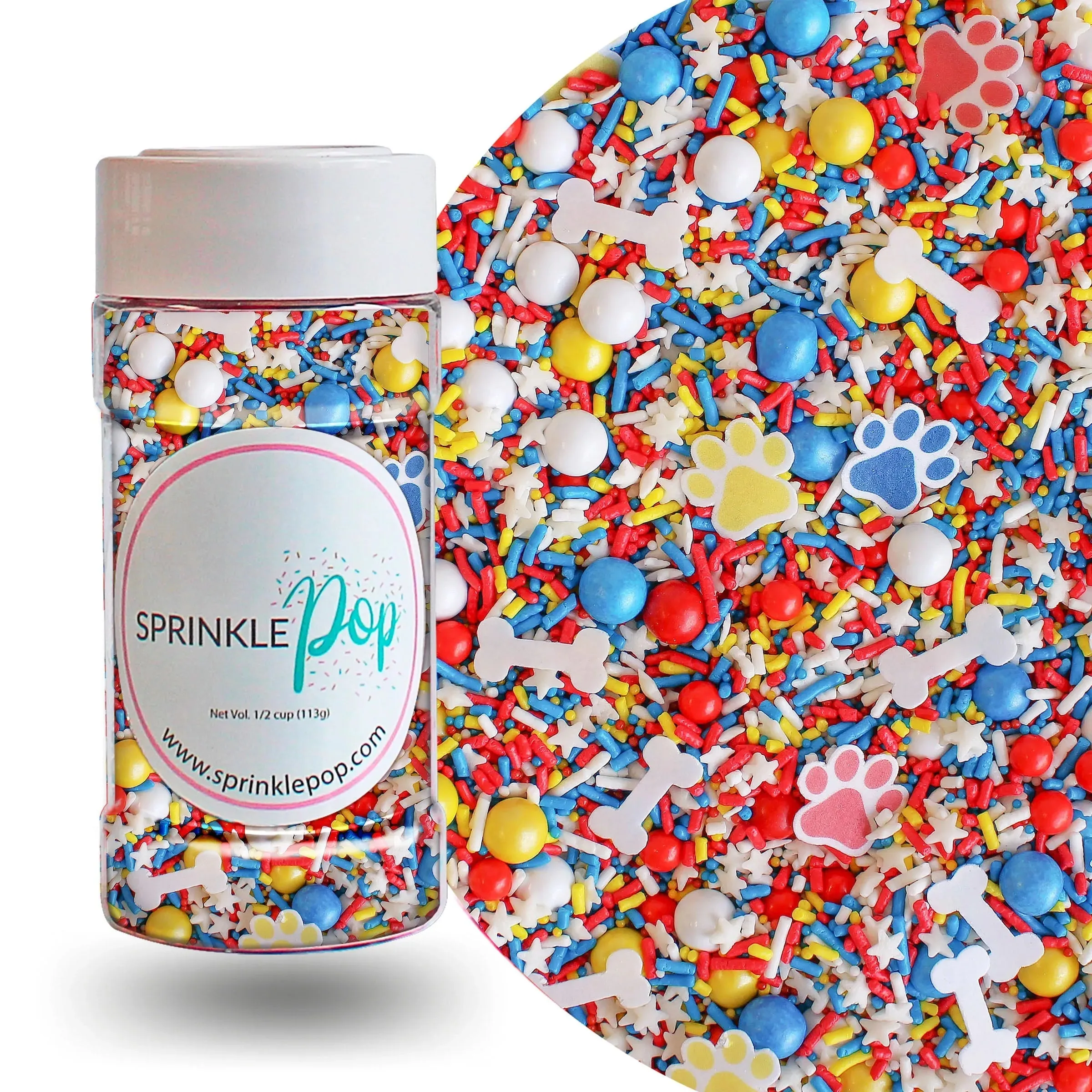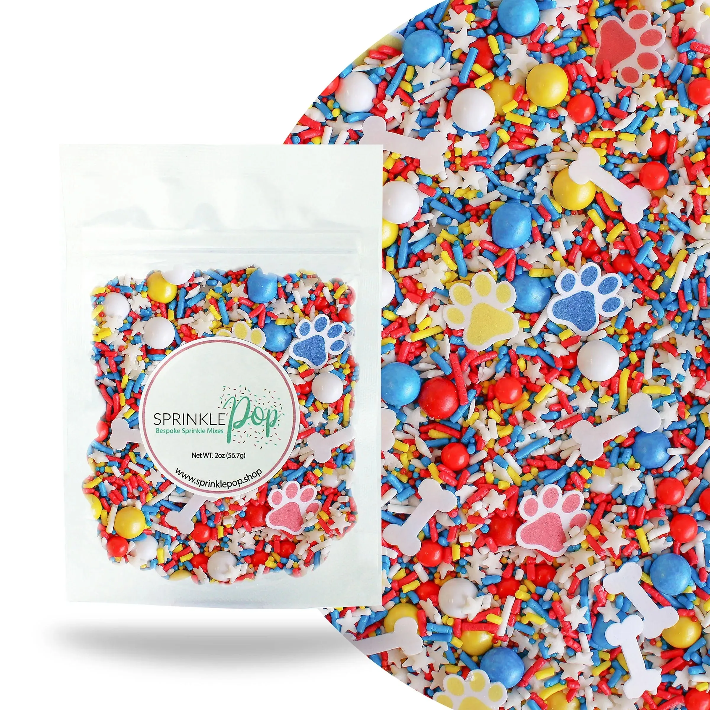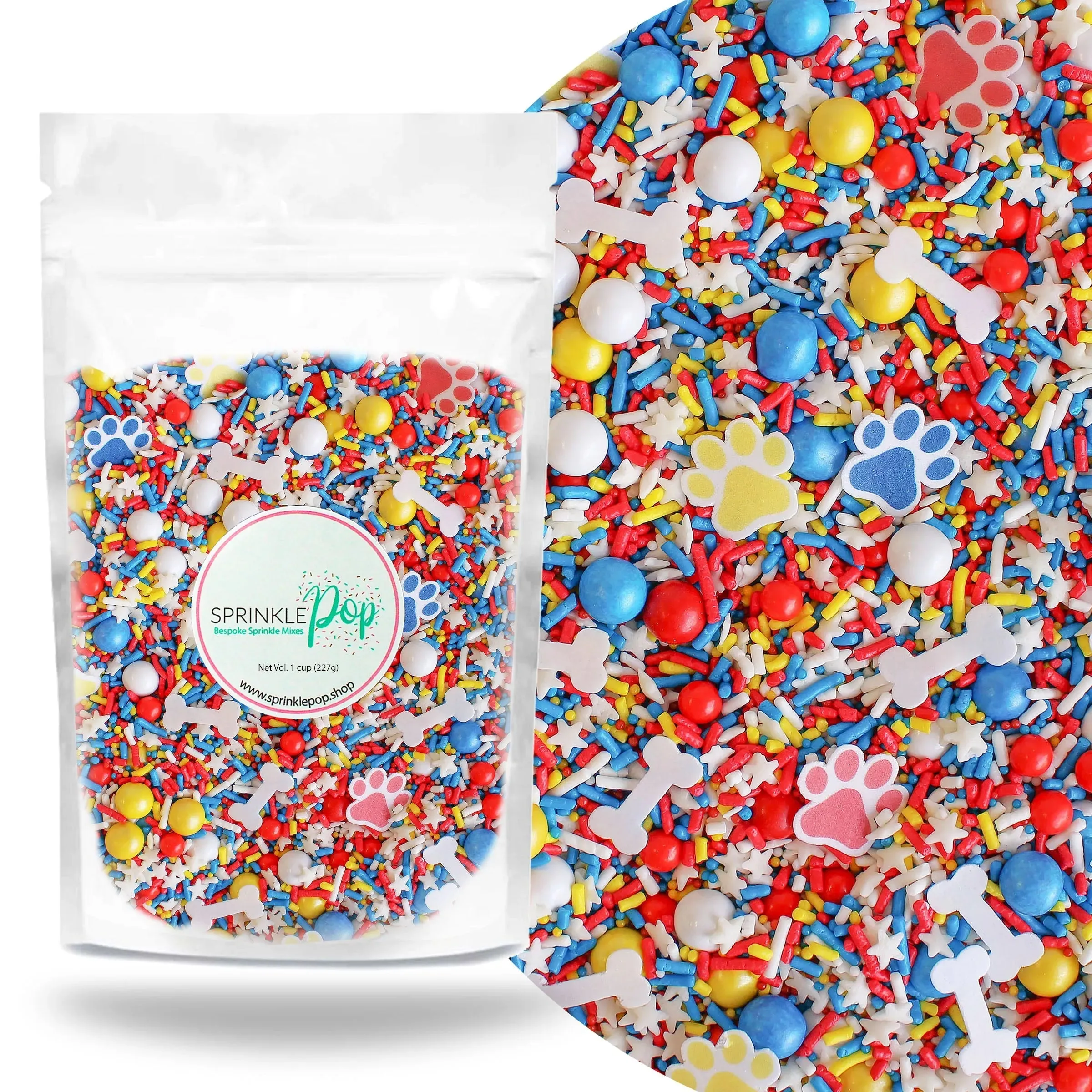 Featuring a blend of red, blue, and yellow sprinkles, as well as wafer paw prints and dog bones, this mix is perfect for any party or celebration. Use as a cake or cookie topper, ice cream topping, or cupcake decoration for a fun and festive touch.