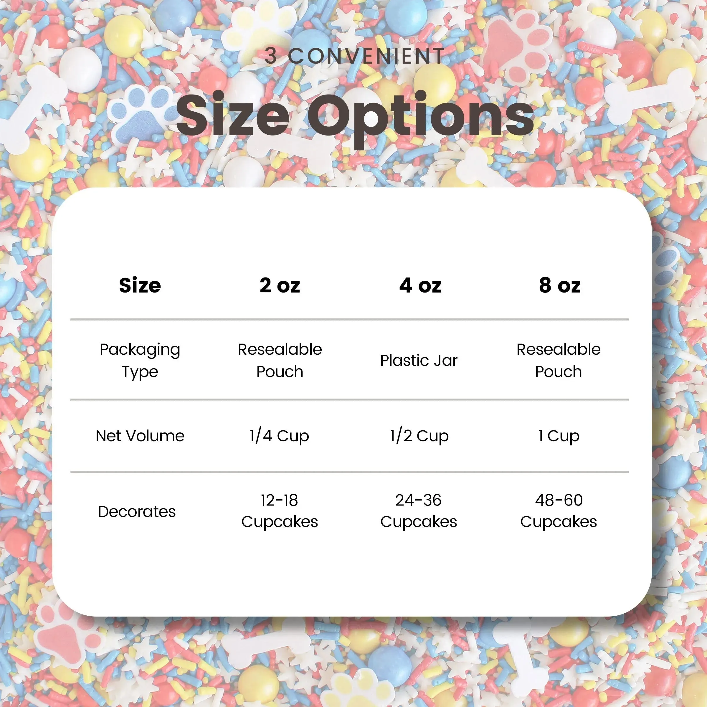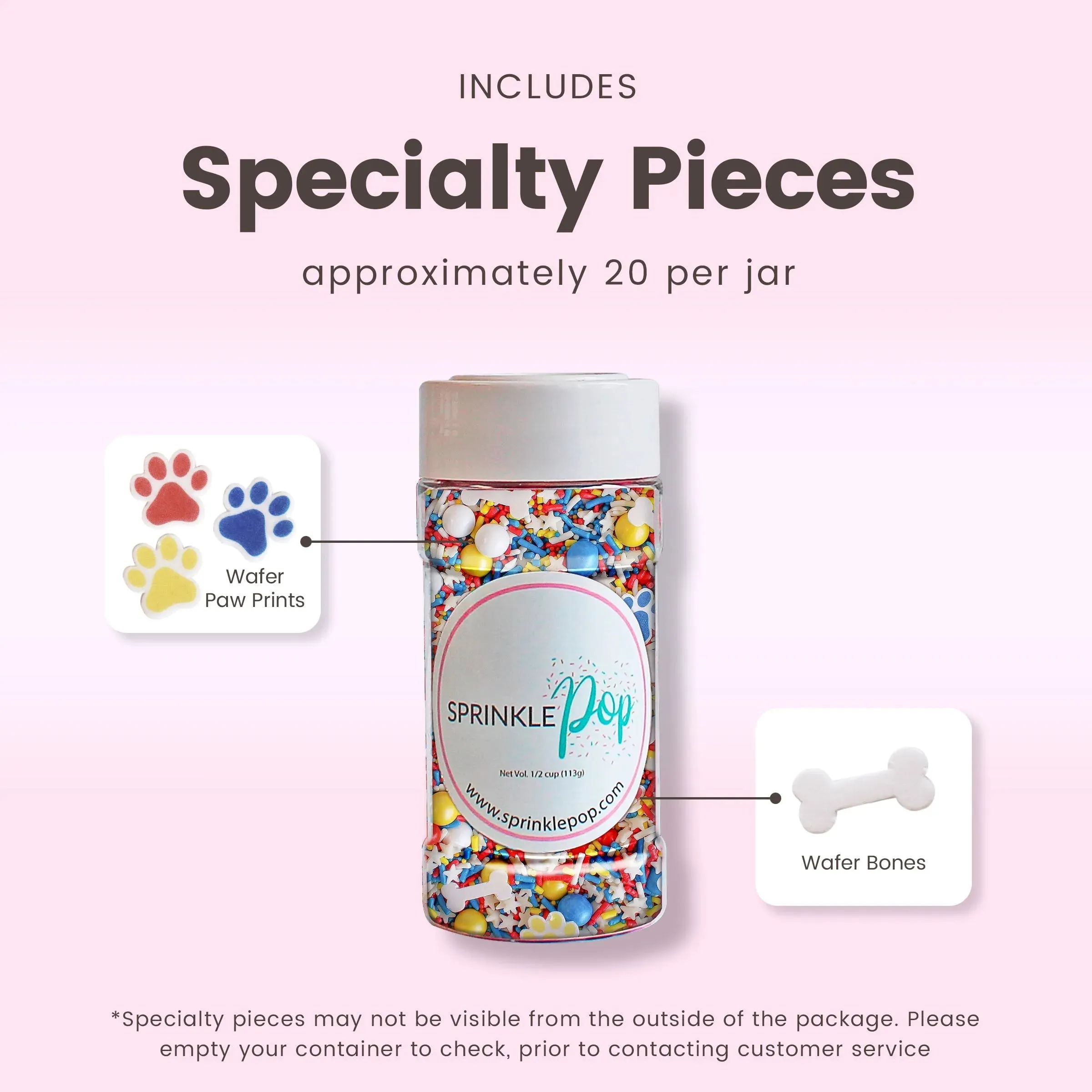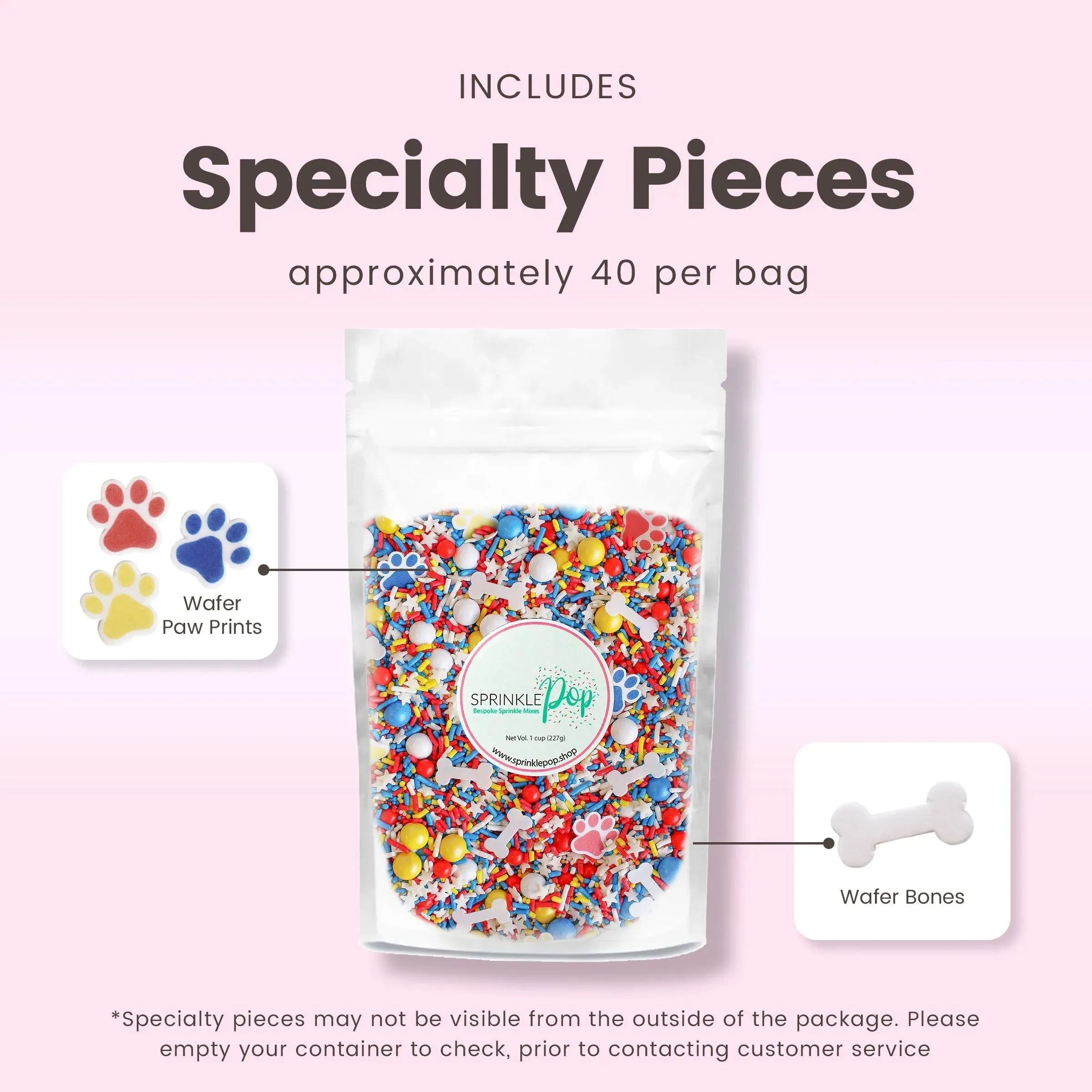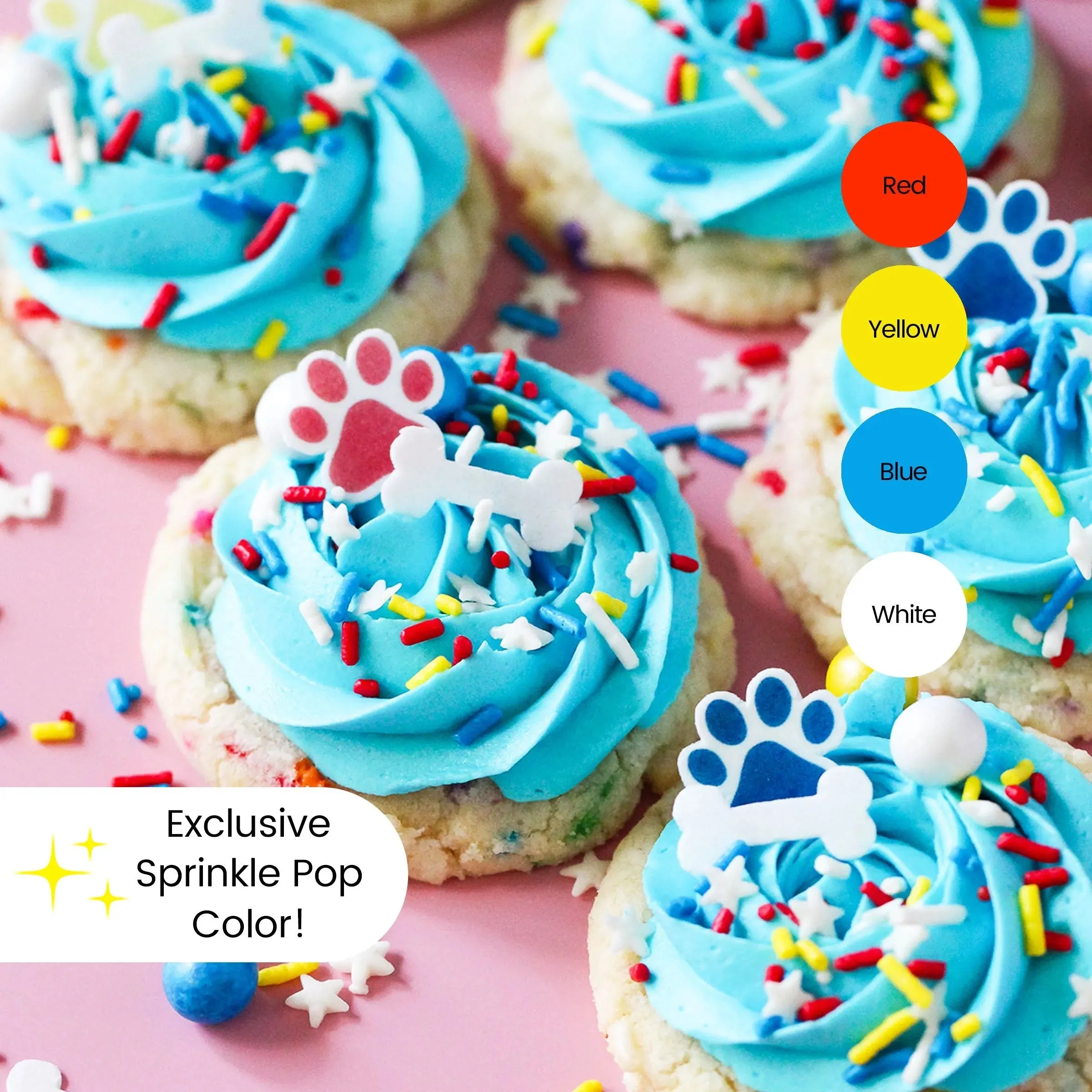 Featuring a blend of red, blue, and yellow sprinkles, as well as wafer paw prints and dog bones, this mix is perfect for any party or celebration. Use as a cake or cookie topper, ice cream topping, or cupcake decoration for a fun and festive touch.