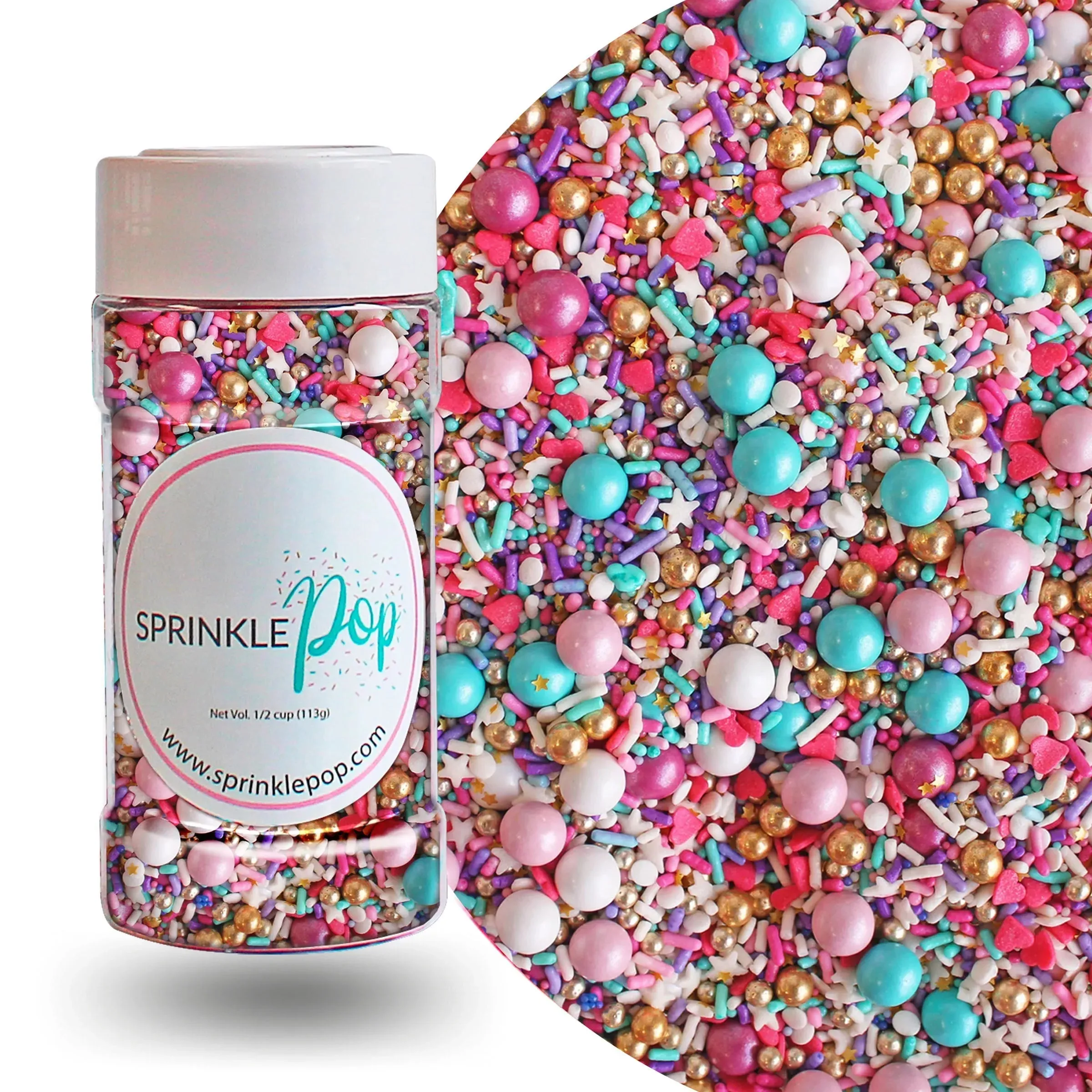 Aqua sprinkles pop against a pink and purple background in Hey Sugar!