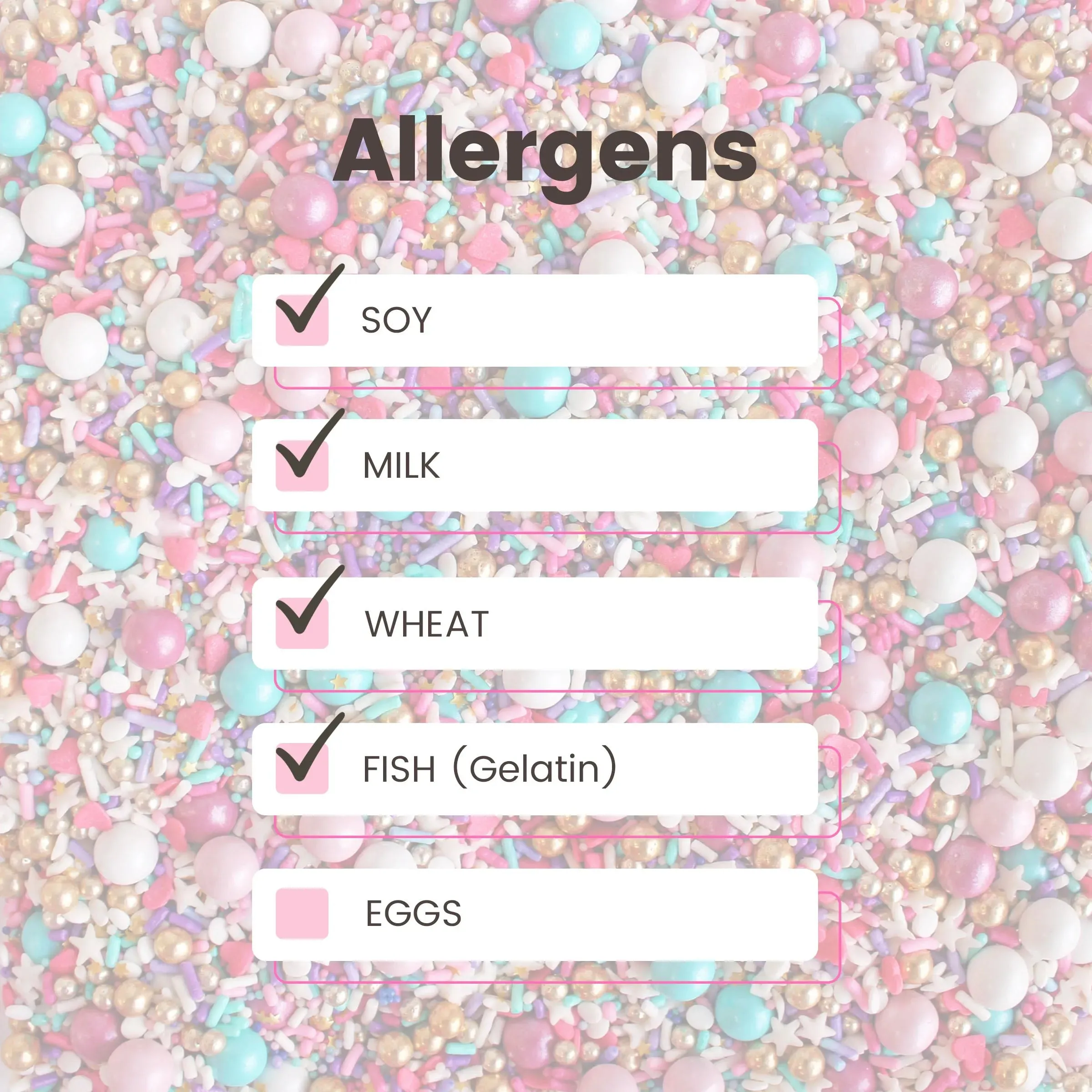INGREDIENTS: Acetic acid, carnauba wax, carrageenan, cellulose gum, confectioner's glaze, corn starch, dextrin, gelatin (FISH), glucose powder, glycerin, gum Arabic, HPMC, magnesium silicate, natural and artificial flavors, palm kernel fat, palm kernel oil, palm oil, propylene glycol, rice flour, lecithin (SOY), sugar, tapioca starch, xanthan gum, wheat starch (WHEAT), blue 1 (e132), red 3 (e127), red 40 (e129), silver (e174), titanium dioxide (e171), yellow 5 (e102), yellow 6 (e110), citric acid and less that 1/10 of 1% sodium benzoate