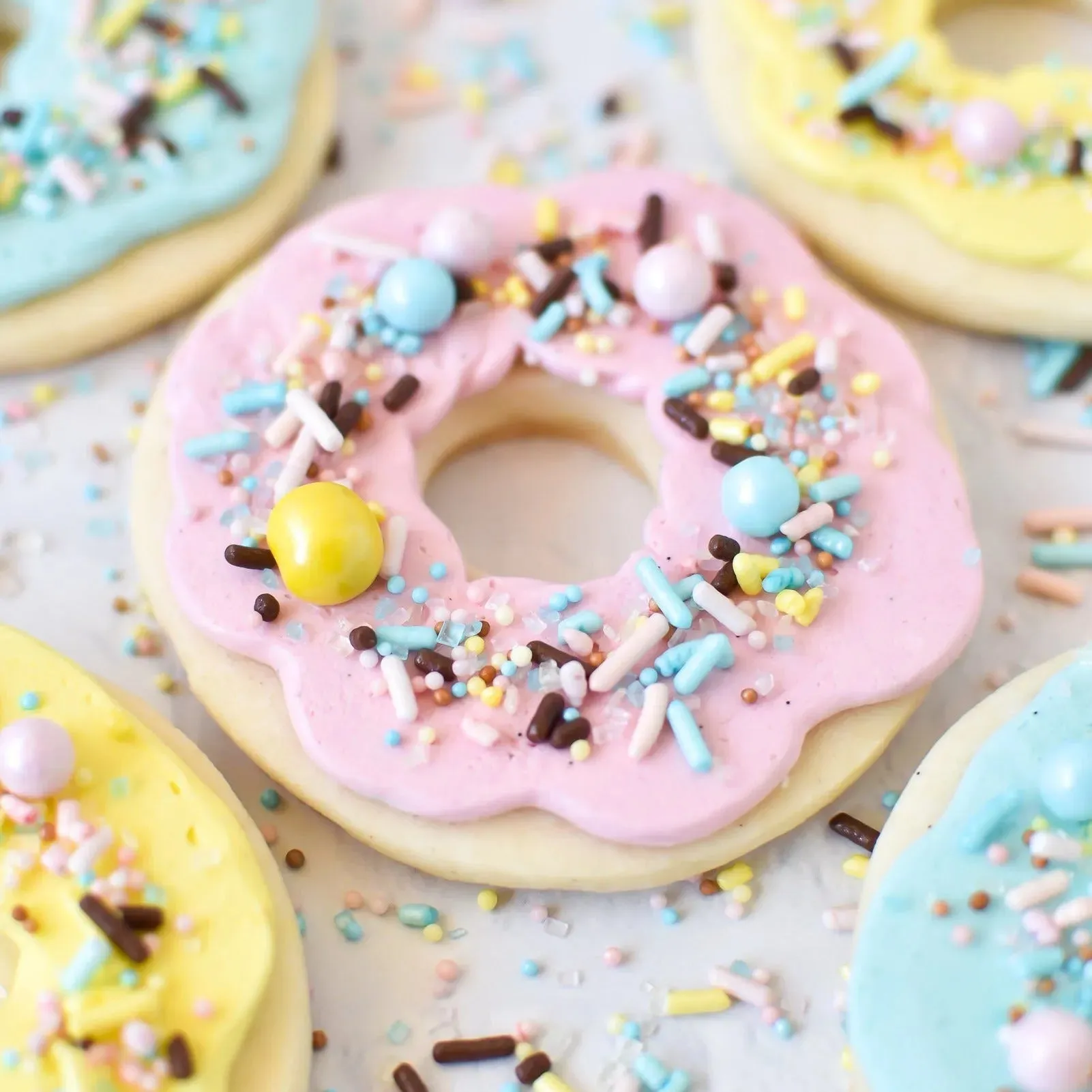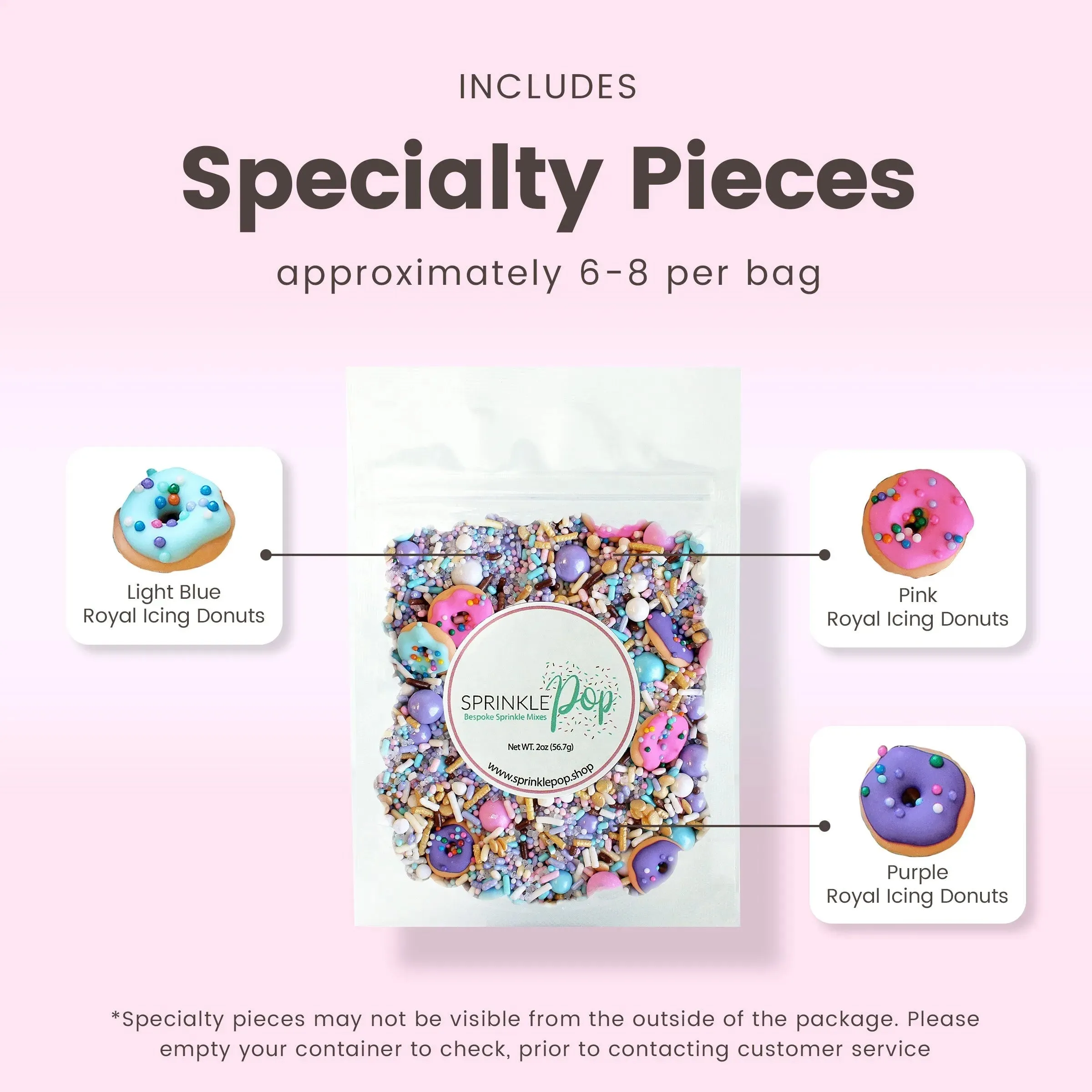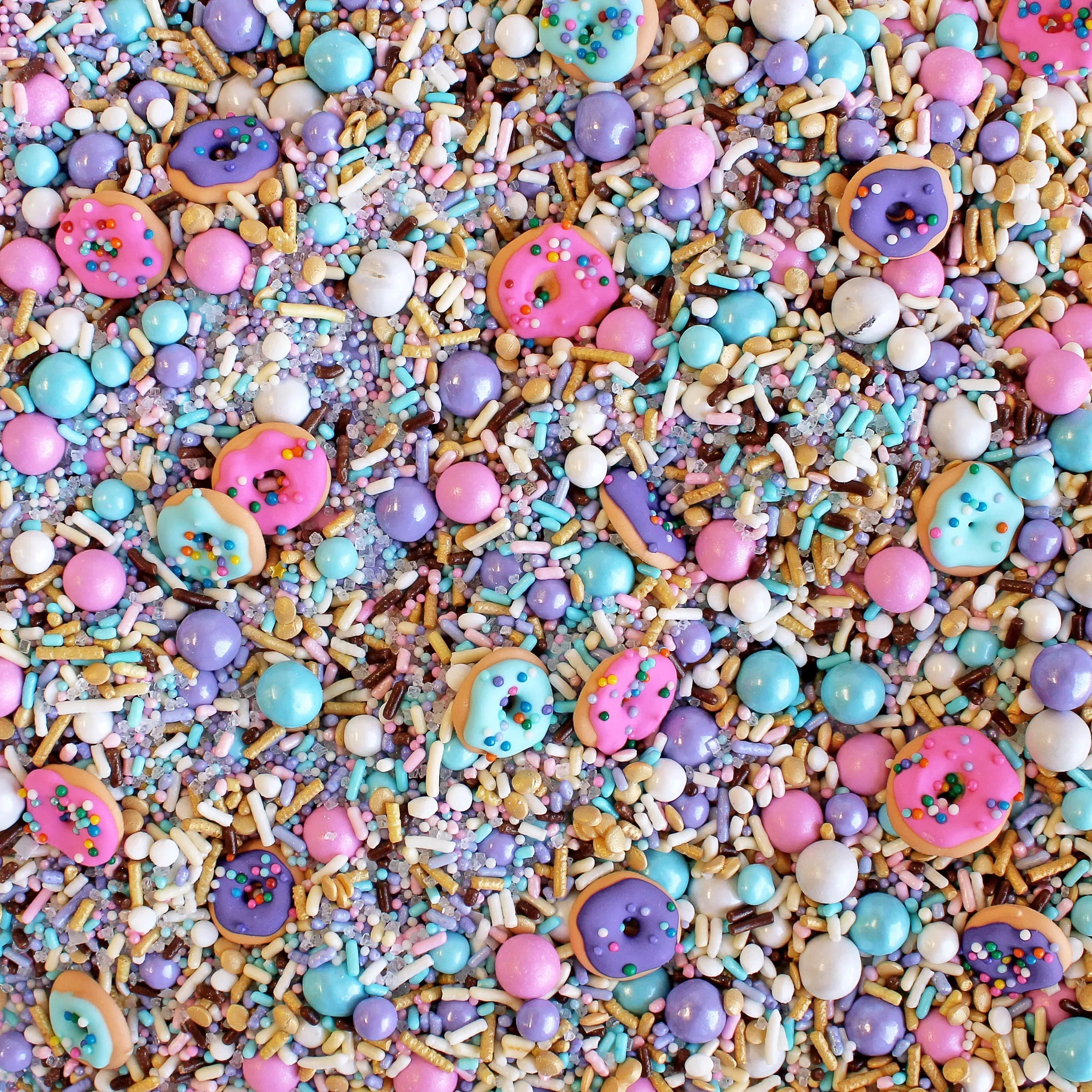 Pastel Donut sprinkle mix is a medley of pastel pink, purple, and blue sprinkles with tiny chocolate accents. It's finished with hand-piped tiny royal Icing sprinkled donuts!