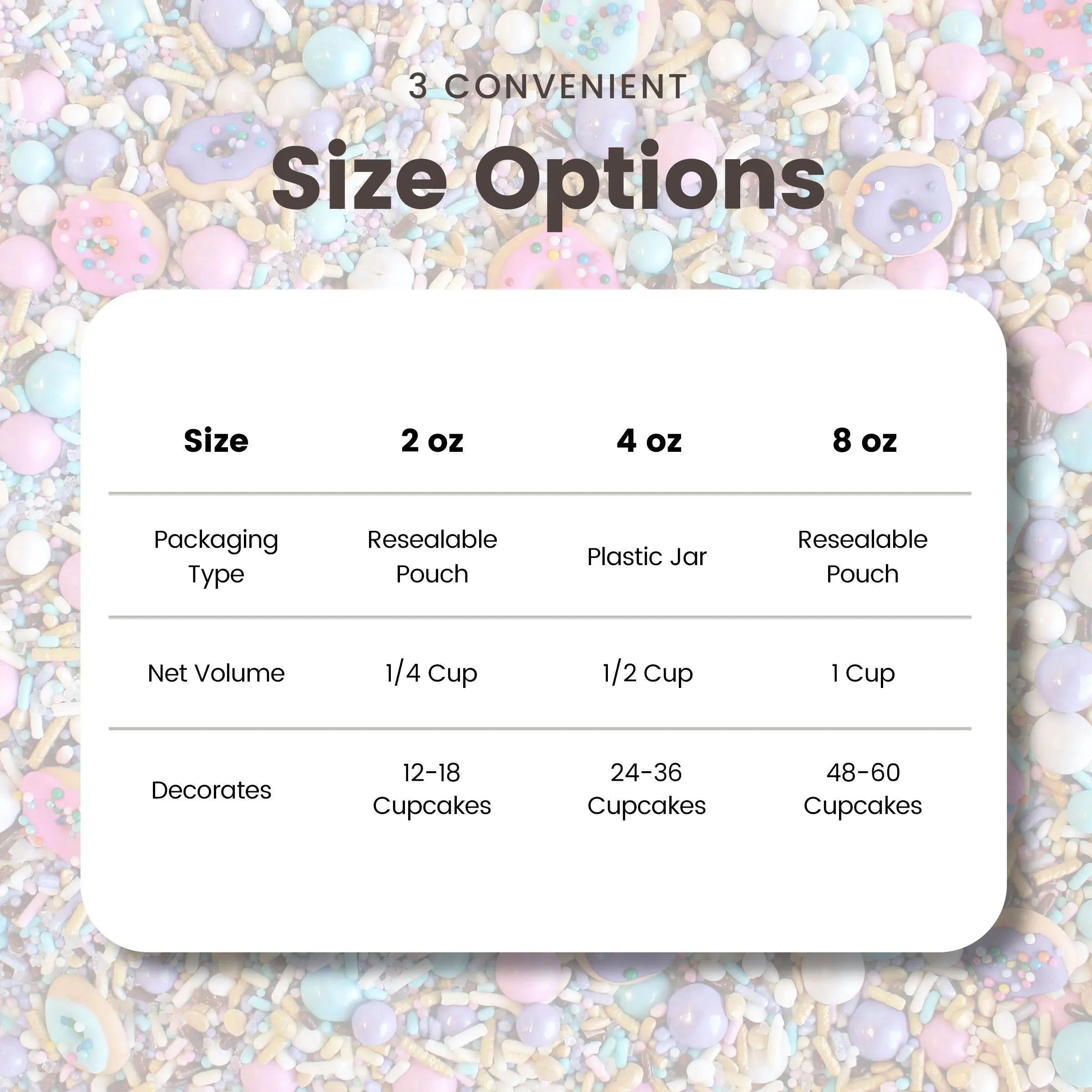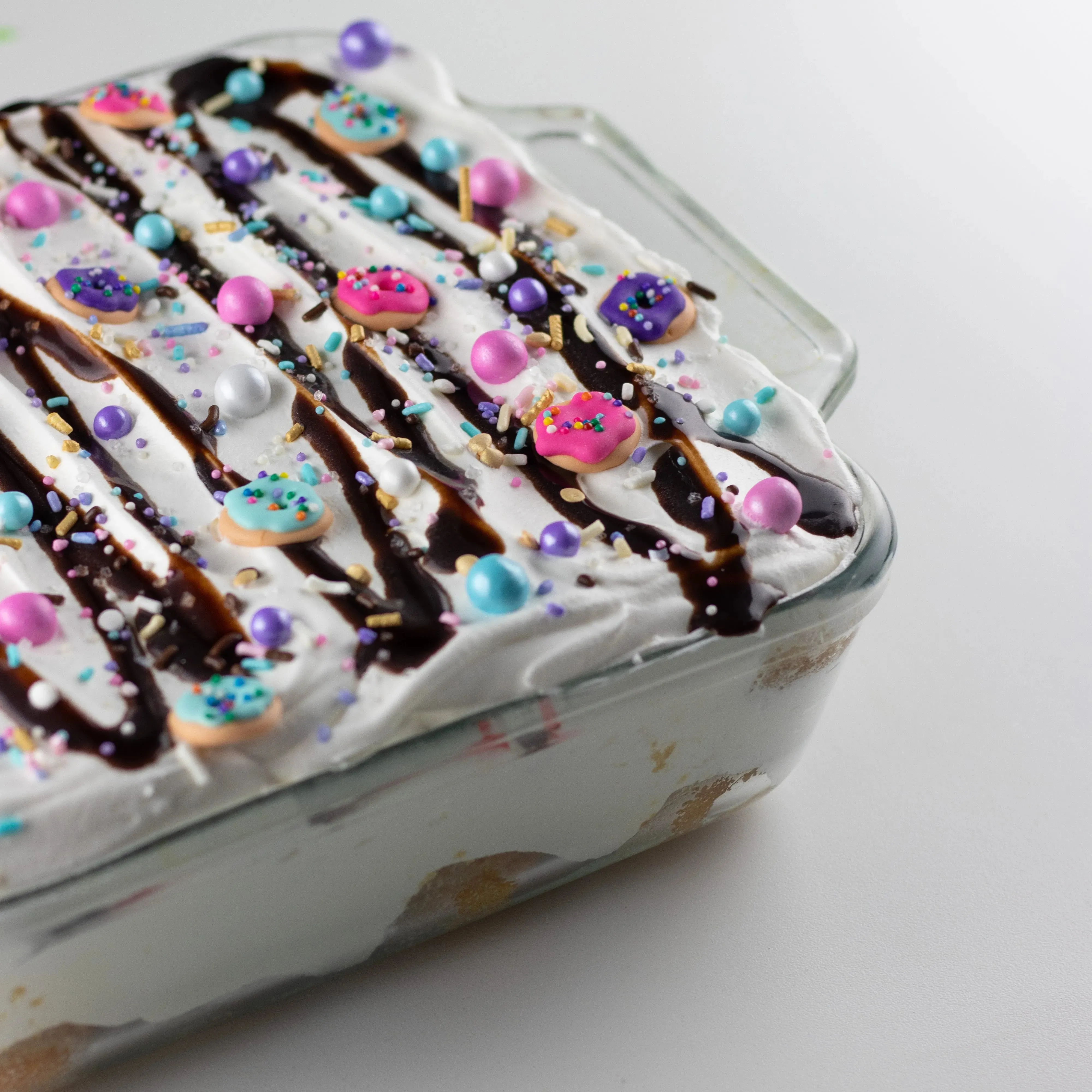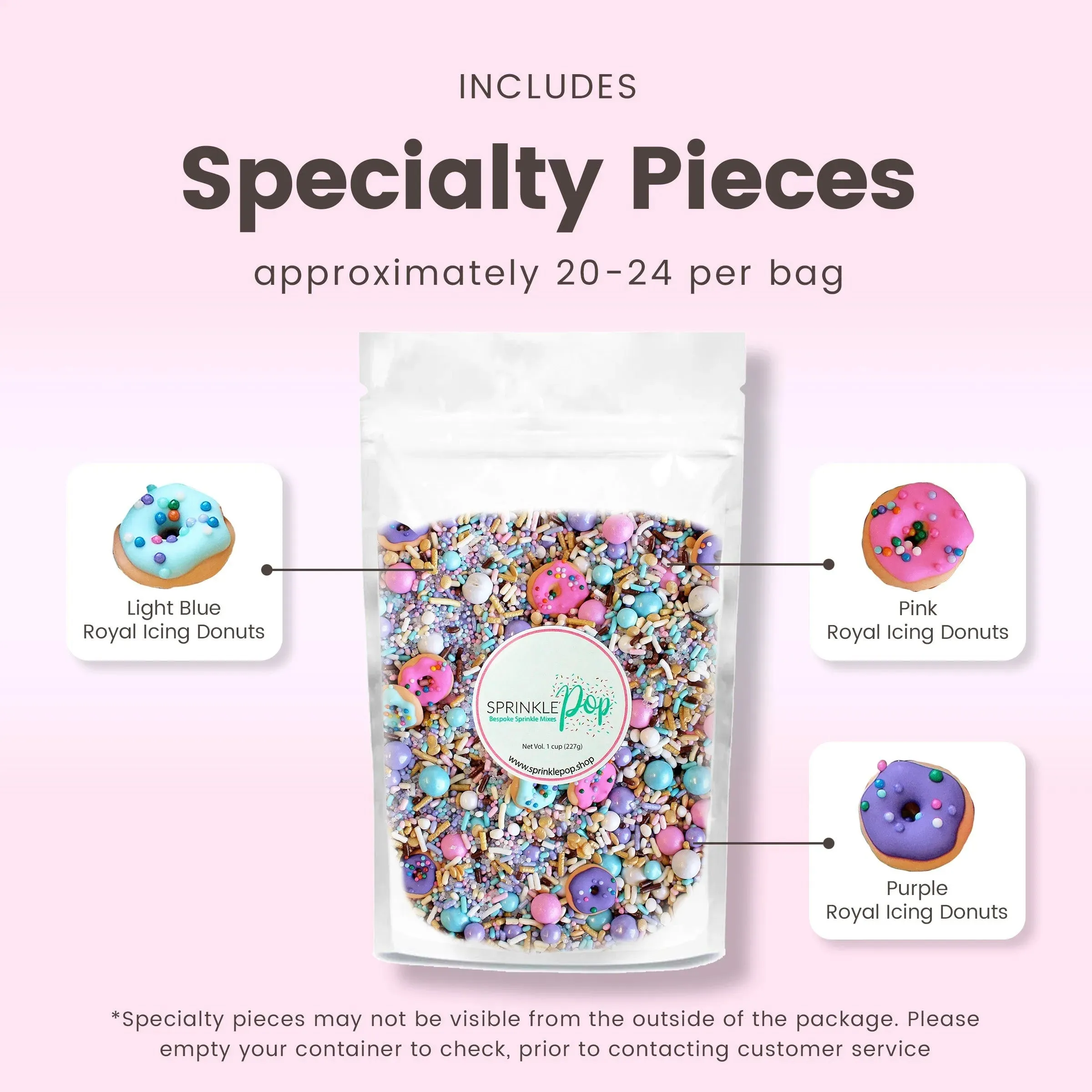 Pastel Donut sprinkle mix is a medley of pastel pink, purple, and blue sprinkles with tiny chocolate accents. It's finished with hand-piped tiny royal Icing sprinkled donuts!
