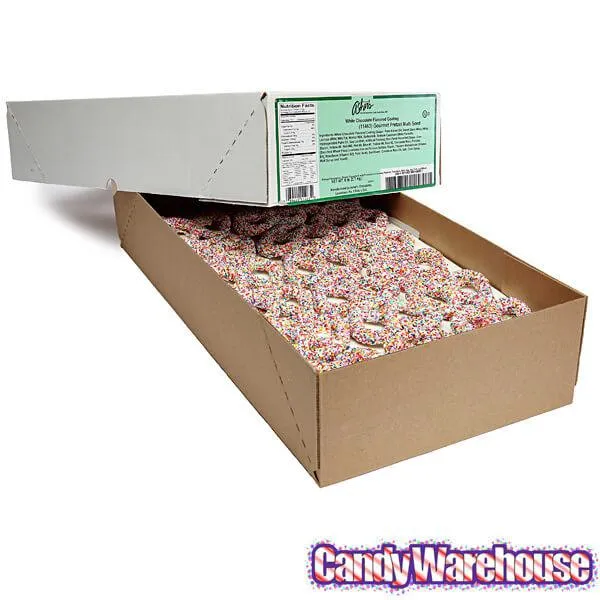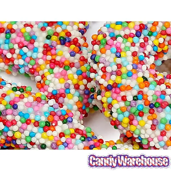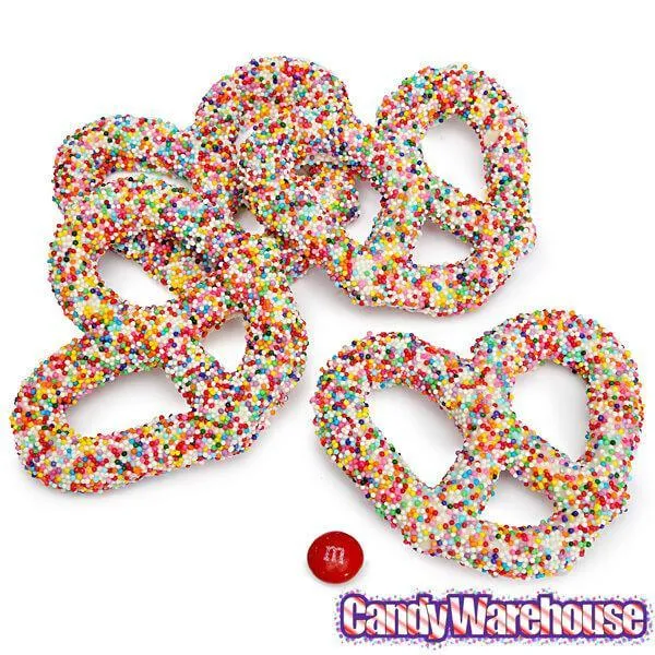 Colorful, tiny candy balls adorn these white chocolate coated pretzels. Cute and delicious!