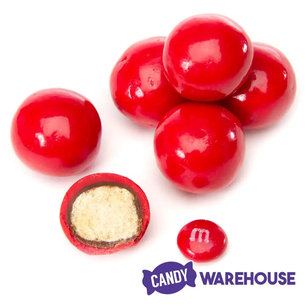 Bag contains 5 pounds of Red Milk Chocolate Covered Malt Balls Candy.