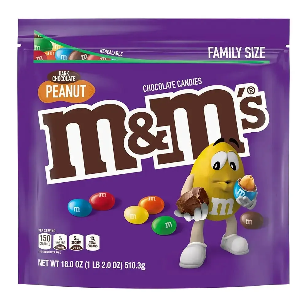 Bag contains 18 ounces of Peanut Dark Chocolate M&M's Candy.