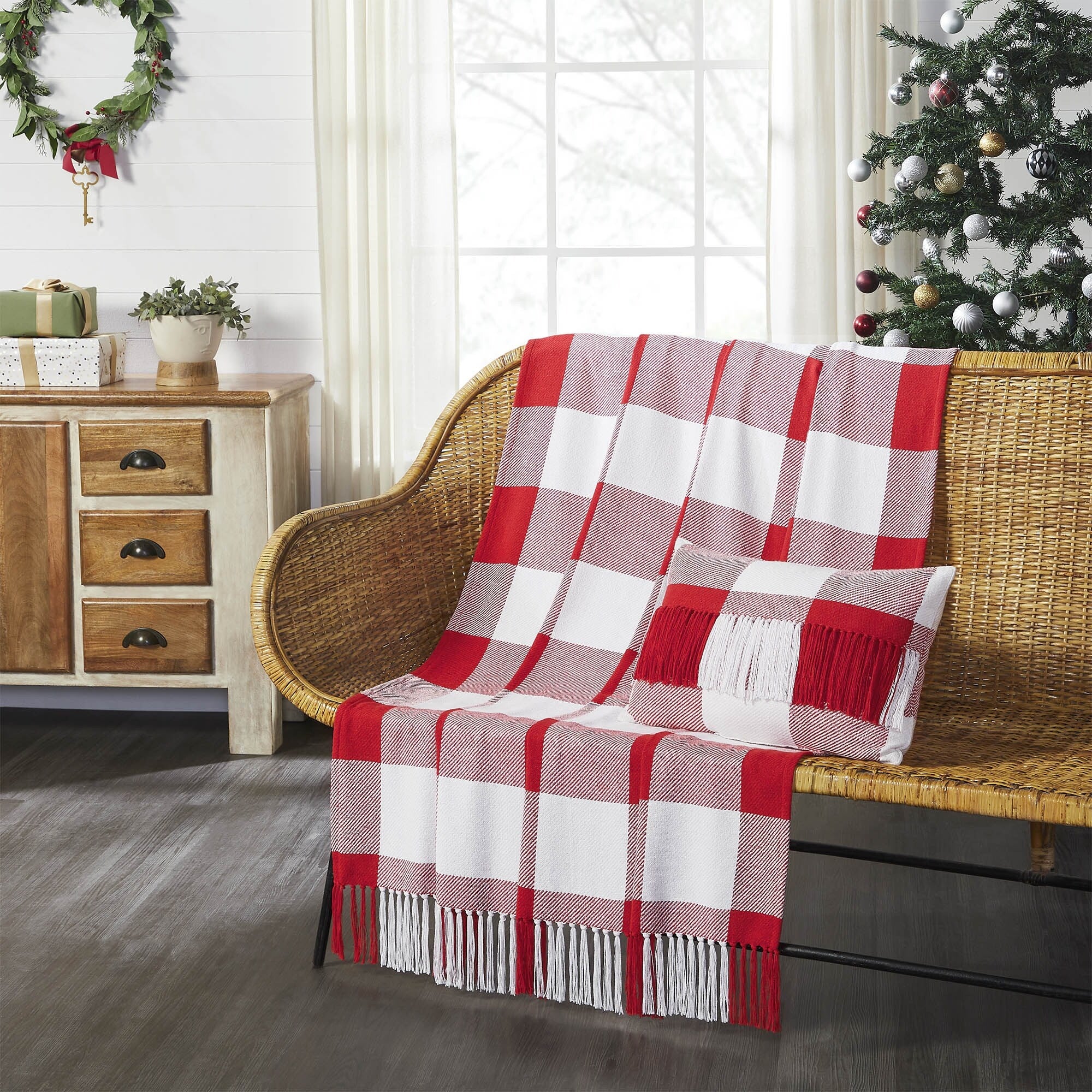 Whether draped over the back of chair or keeping you cozy, this classic plaid throw blanket will add a sophisticated style wherever it lands. The Annie Red Check Woven Throw measures 50x60 inches and is constructed with a durable cotton polyester blend. This throw features classic red and white checks for a timeless plaid design. The tasseled throw blanket is perfect for holiday decor or year-round farmhouse style. Coordinates with the Annie Red Check Collection by VHC for all of your holiday farmhouse needs.